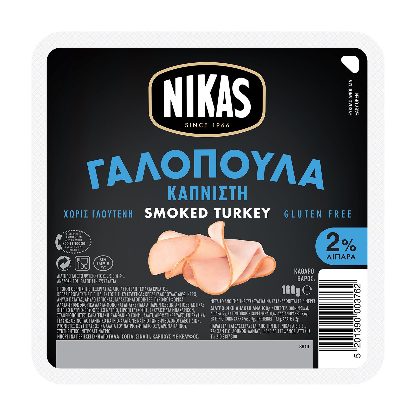 NIKAS Καπνιστή Γαλοπούλα σε φέτες Χωρίς γλουτένη 160g