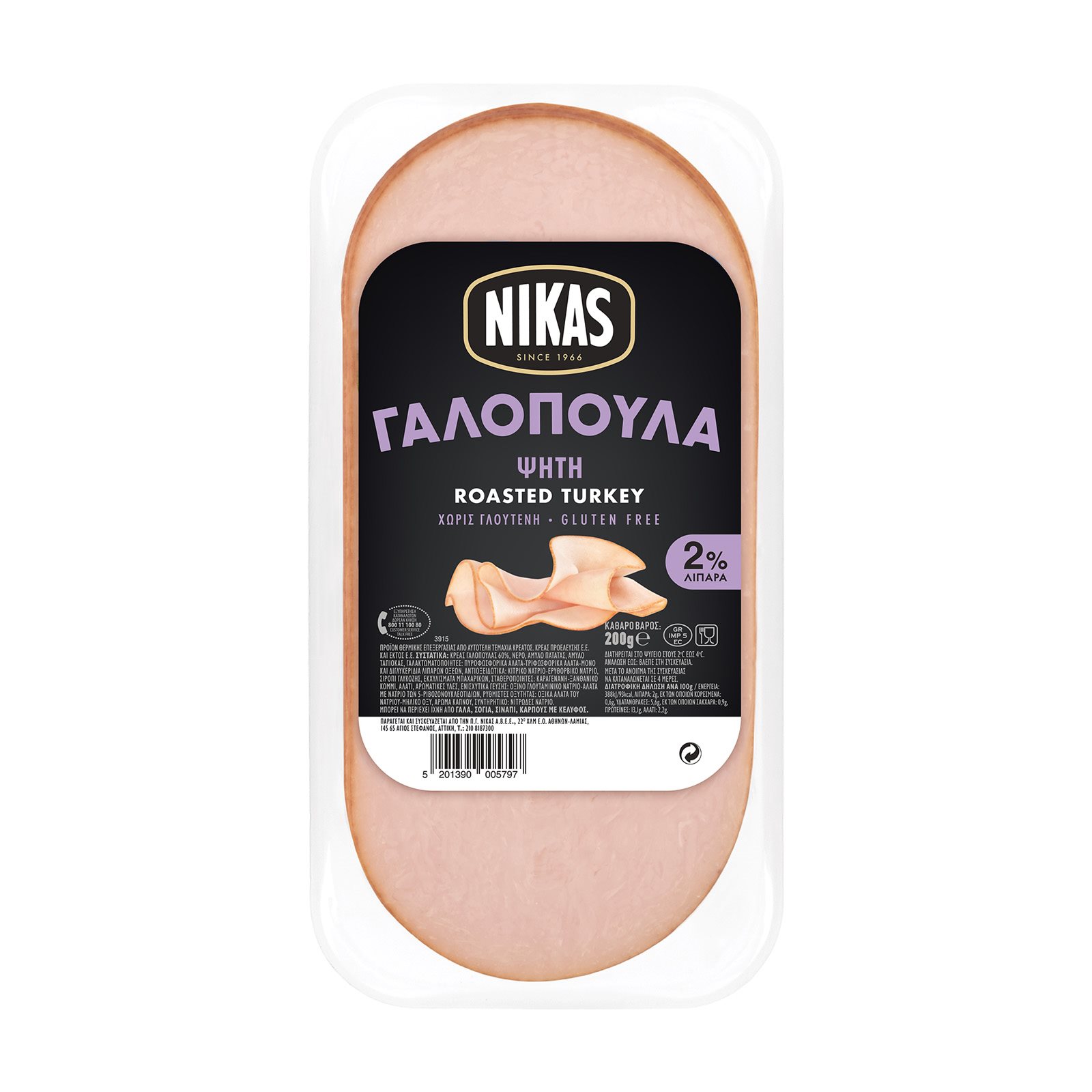 Κρέας γαλοπούλας 60%, νερό, άμυλο πατάτας, άμυλο ταπιόκας, γαλακτωματοποιητές: πυροφωσφορικά άλατα-τριφωσφορικά άλατα-μονο και διγλυκερίδια λιπαρών οξέων, αντιοξειδωτικά: κιτρικό νάτριο-ερυθορβικό νάτριο, σιρόπι γλυκόζης, εκχυλίσματα μπαχαρικών, σταθεροποιητές: καραγενάνη-ξανθανικό κόμμι, αλάτι, αρωματικές ύλες, ενισχυτικά γεύσης: όξινο γλουταμινικό νάτριο-άλατα με νάτριο των 5-ριβοζονουκλεοτιδίων, ρυθμιστές οξύτητας: οξικά άλατα του νατρίου-μηλικό οξύ, άρωμα καπνού, συντηρητικό: νιτρώδες νάτριο.