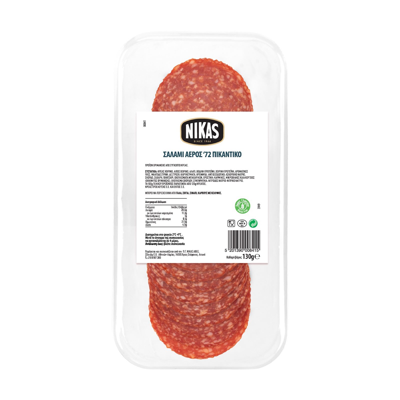 NIKAS Σαλάμι Αέρος '72 Πικάντικο σε φέτες Χωρίς γλουτένη 130g