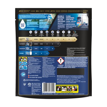 5-<15% μη-ιονικές επιφανειοδραστικές ουσίες, 5-<15% λευκαντικοί παράγοντες με βάση το οξυγόνο , πολυκαρβοξυλικές ενώσεις, φωσφονικές ενώσεις. Περιέχει ένζυμα (Πρωτεϊνάση, Αμυλάση). Άρωμα (Limonene, Geraniol).