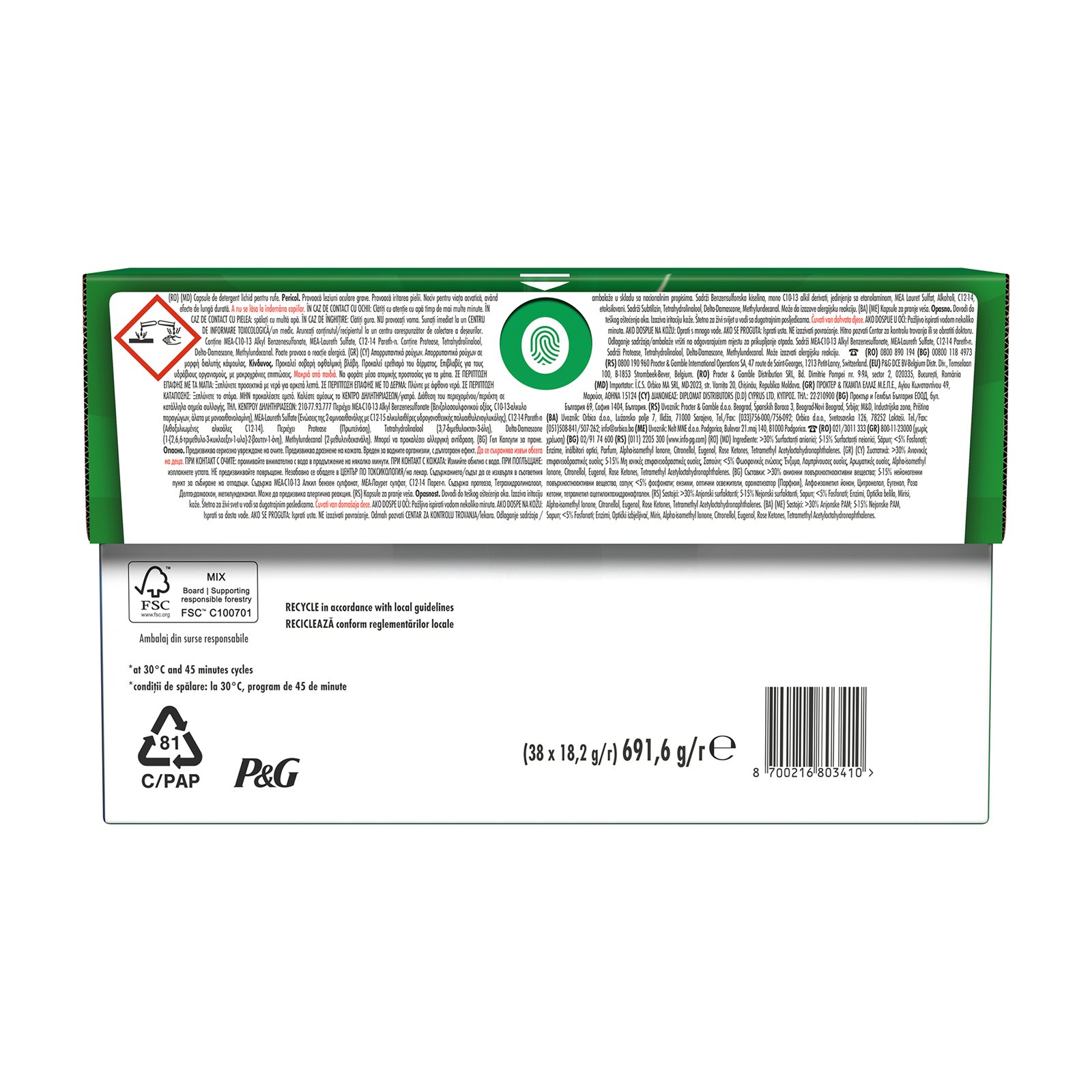 Περιέχει MEA-C10-13 Alkyl Benzenesulfonate (Βενζολοσουλφονικού οξέος, C10-13-αλκυλο παραγώγων, άλατα με μονοαιθανολαμίνη), MEA-Laureth Sulfate (Ενώσεις της 2-αμινοαιθανόλης με C12-15 αλκυλαιθέρες υδρογονοθειικής πολυαιθυλενογλυκόλης), C12-14 Pareth-n (Αιθοξυλιωμένες αλκοόλες C12-14). Περιέχει Protease (Πρωτεϊνάση), Tetrahydrolinalool (3,7-διμεθυλοκταν-3-όλη), Delta-Damascone (1-(2,6,6-τριμεθυλο-3-κυκλοεξεν-1-υλο)-2-βουτεν-1-όνη), Methylundecanal (2-μεθυλενδεκανάλη). Μπορεί να προκαλέσει αλλεργική αντίδραση.