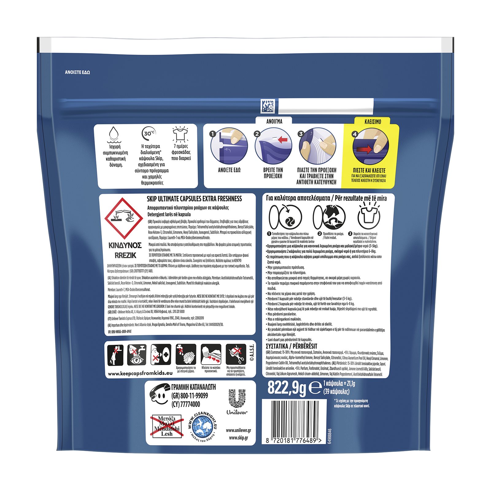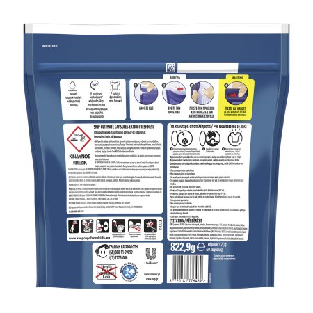 Χρησιμοποιήστε 2 κάψουλες για πολύ λερωμένα ρούχα, σκληρό νερό ή για πλυντήρια 6-8kg.