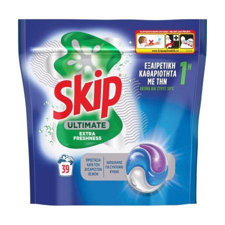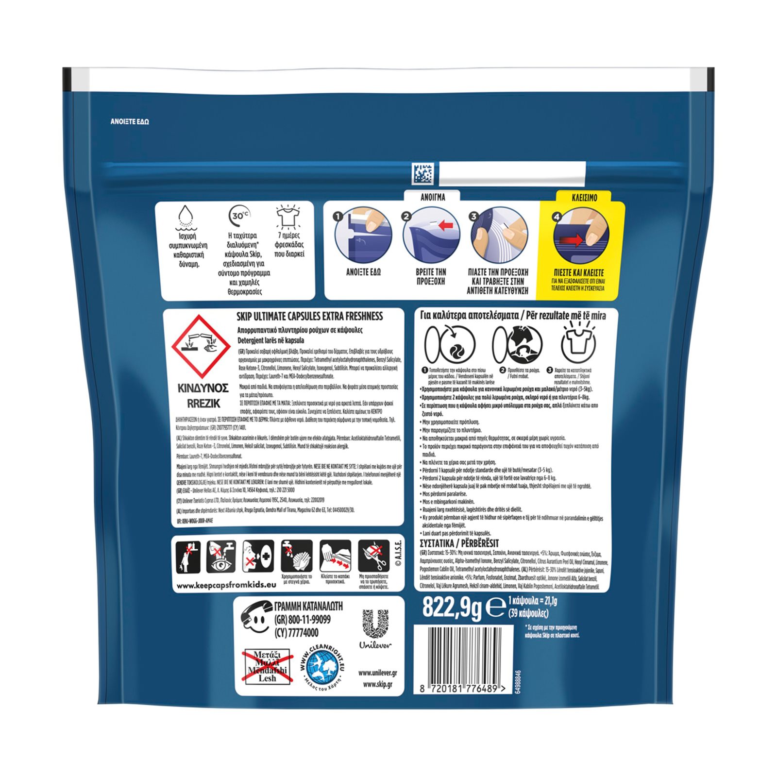 Χρησιμοποιήστε 2 κάψουλες για πολύ λερωμένα ρούχα, σκληρό νερό ή για πλυντήρια 6-8kg.