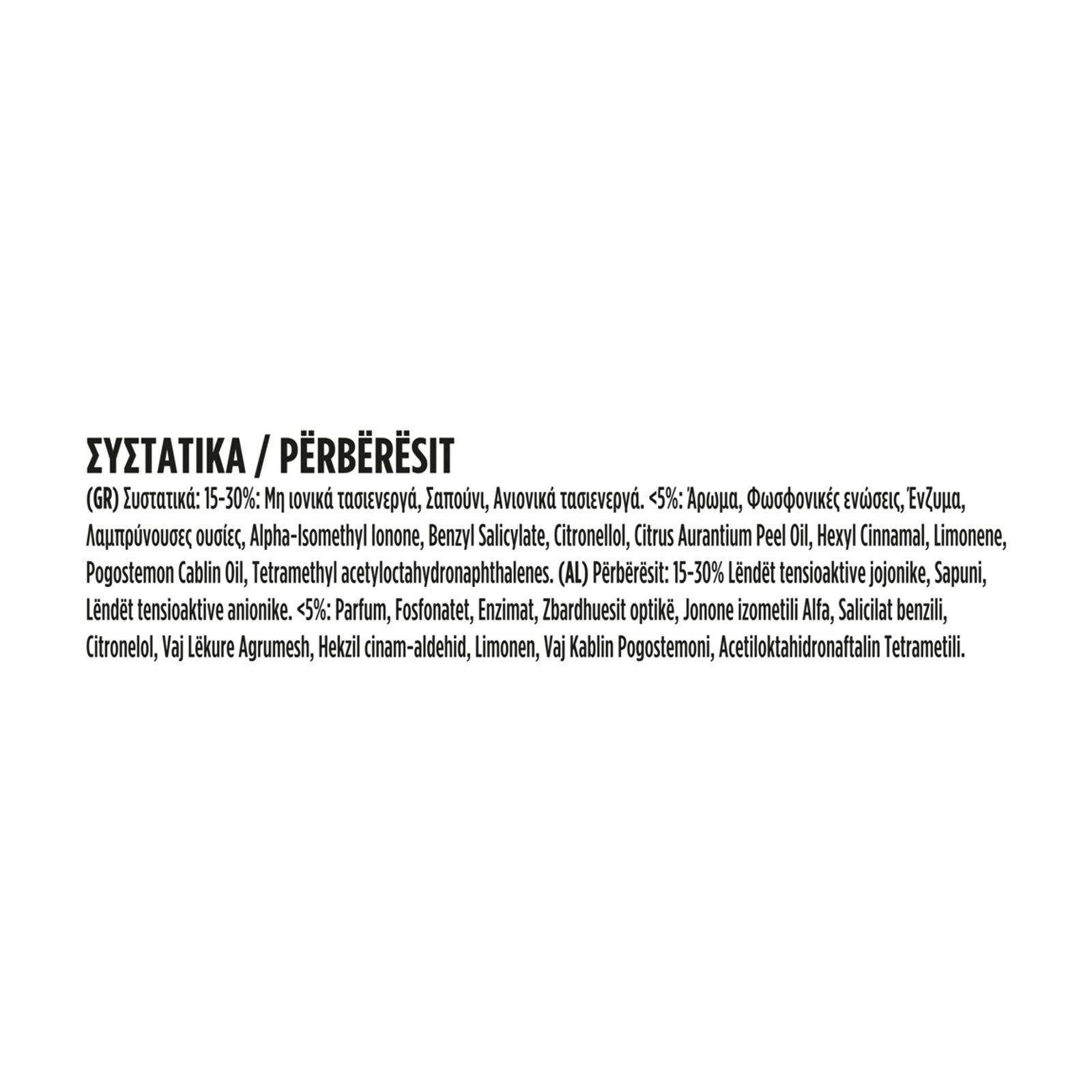 15-30%: Μη ιονικά τασιενεργά, Σαπούνι, Ανιονικά τασιενεργά. <5%: Άρωμα, Φωσφονικές ενώσεις, Ένζυμα, Λαμπρύνουσες ουσίες, Alpha-Isomethyl Ionone, Benzyl Salicylate, Citronellol, Citrus Aurantium Peel Oil, Hexyl Cinnamal, Limonene, Pogostemon Cablin Oil, Tetramethyl acetyloctahydronaphthalenes.