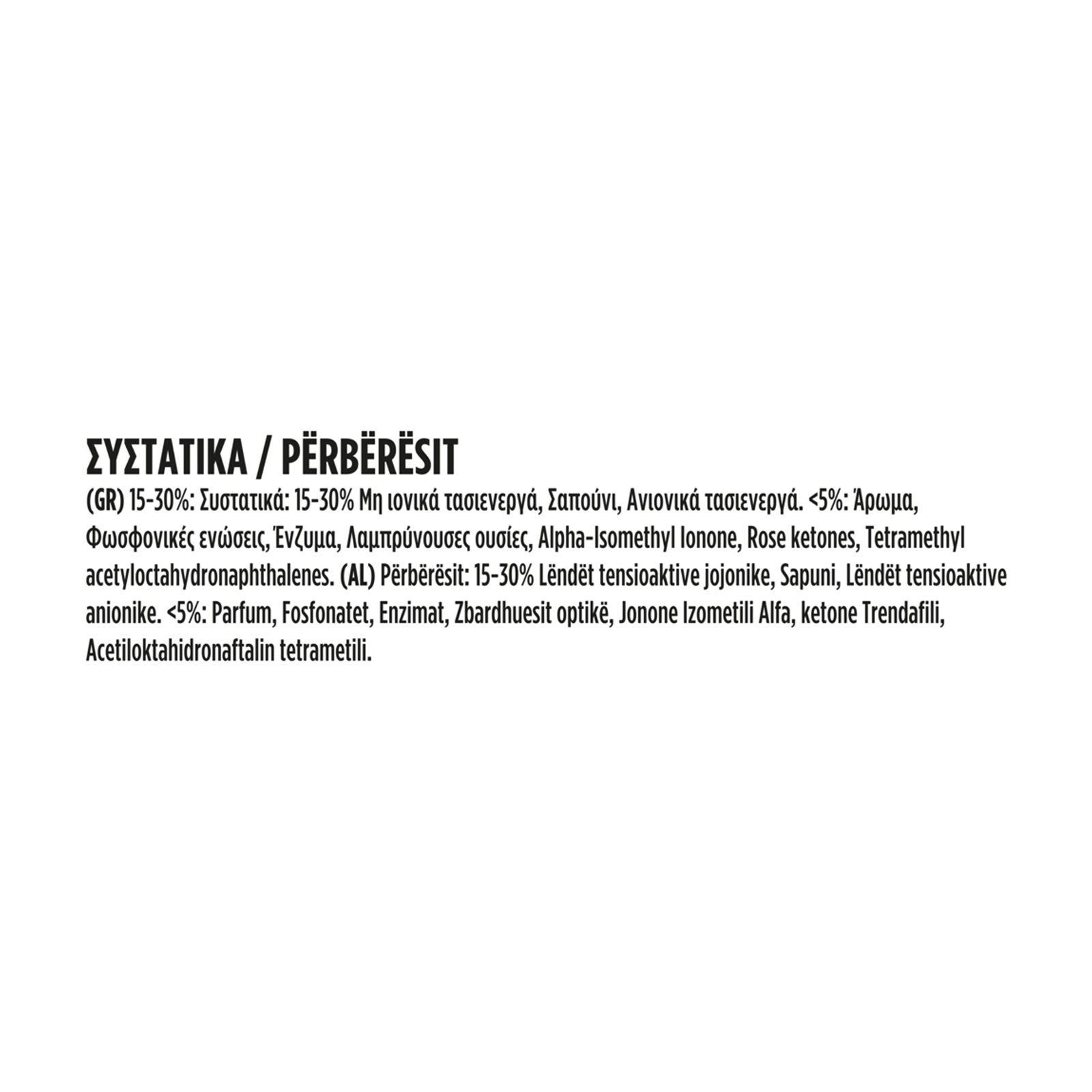 15-30%: Συστατικά: 15-30% Μη ιονικά τασιενεργά, Σαπούνι, Ανιονικά τασιενεργά. <5%: Άρωμα, Φωσφονικές ενώσεις, Ένζυμα, Λαμπρύνουσες ουσίες, Alpha-Isomethyl Ionone, Rose ketones, Tetramethyl acetyloctahydronaphthalenes.
