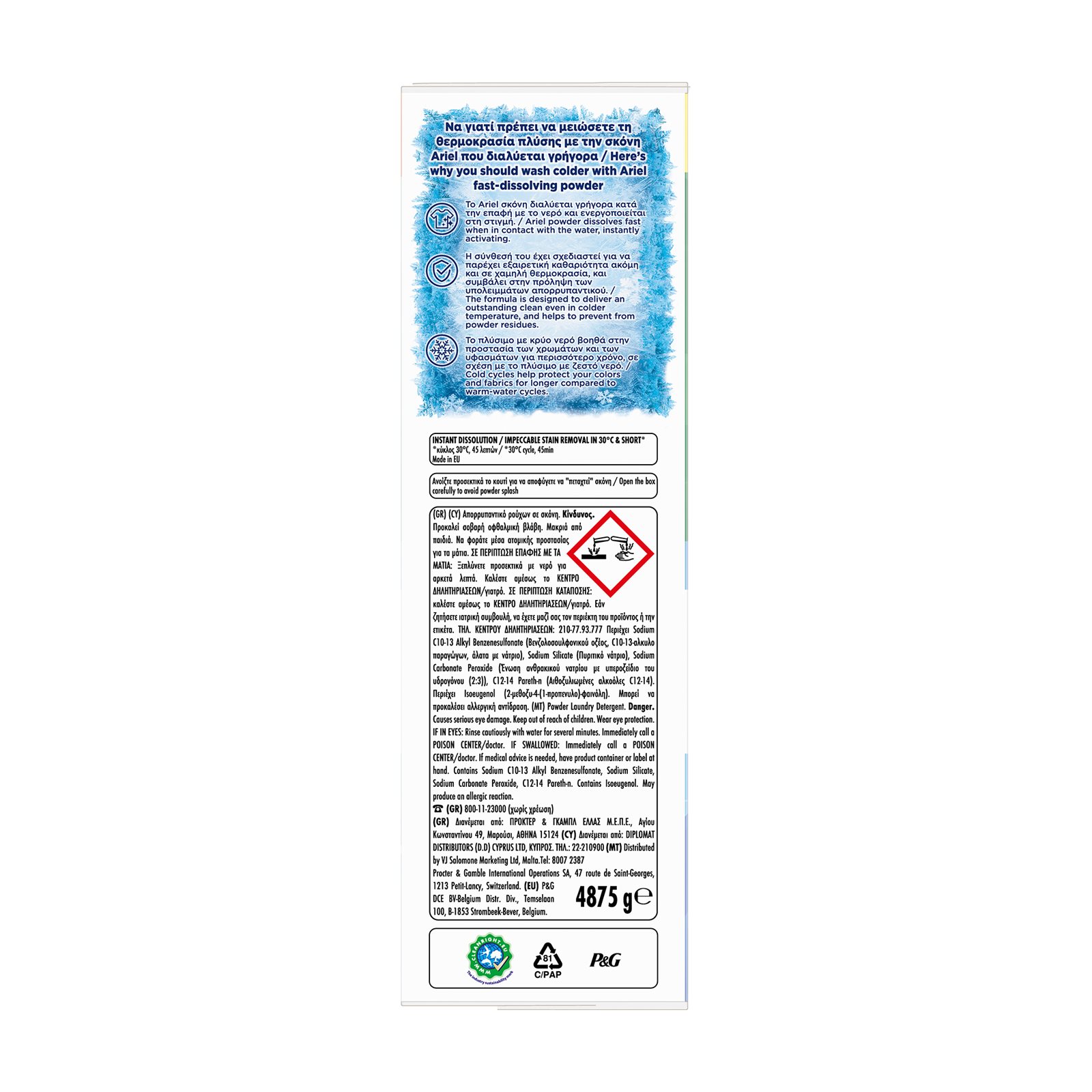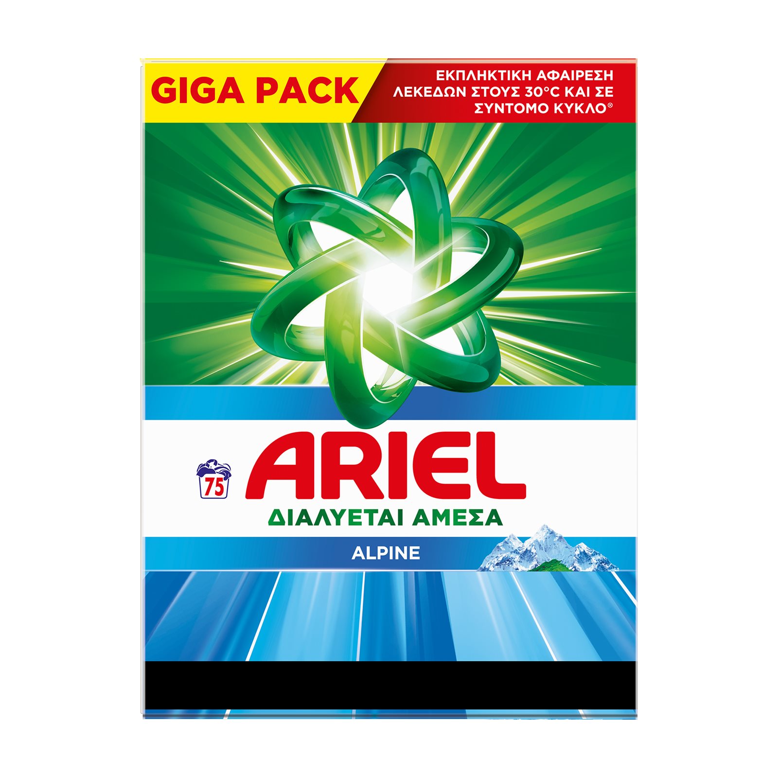 Απορρυπαντικό πλυντηρίου σε σκόνη Ariel Alpine που διαλύεται γρήγορα. Το απορρυπαντικό σε σκόνη Ariel αφαιρεί τους σκληρούς λεκέδες και τις οσμές με την 1η πλύση. Χάρη στη μοναδική τεχνολογία γρήγορης διάλυσης, διαλύεται γρήγορα κατά την επαφή με το νερό, ενεργοποιείται στη στιγμή και εισχωρεί βαθιά στις ίνες ακόμη και σε κρύες πλύσεις. Οι κρύες πλύσεις βοηθούν στην προστασία των υφασμάτων σας για μεγαλύτερο χρονικό διάστημα σε σχέση με πλύσιμο με ζεστό νερό.