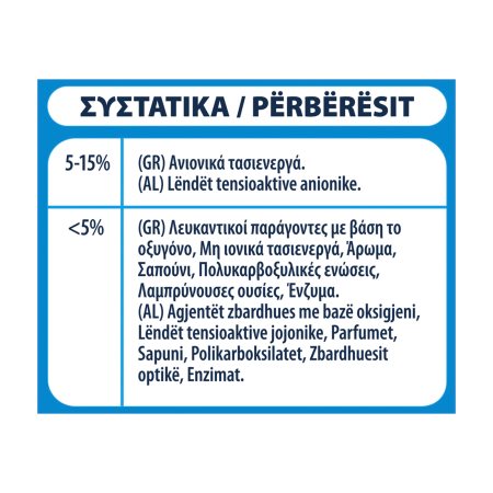 5-15% Aνιονικά τασιενεργά. <5% Λευκαντικοί παράγοντες με βάση το οξυγόνο, Μη ιονικά τασιενεργά, Άρωμα, Πολυκαρβοξυλικές ενώσεις, Σαπούνι, Λαμπρύνουσες ουσίες, Ένζυμα.