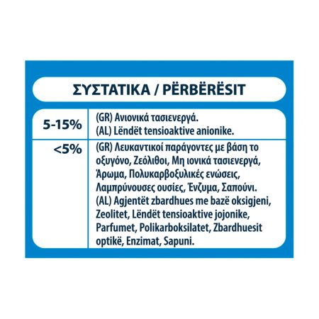 5-15% Ανιονικά τασιενεργά, Λευκαντικοί παράγοντες με βάση το οξυγόνο, Ζεόλιθοι, Μη ιονικά τασιενεργά, Άρωμα, Πολυκαρβοξυλικές ενώσεις, Λαμπρύνουσες ουσίες, Ένζυμα, Σαπούνι.