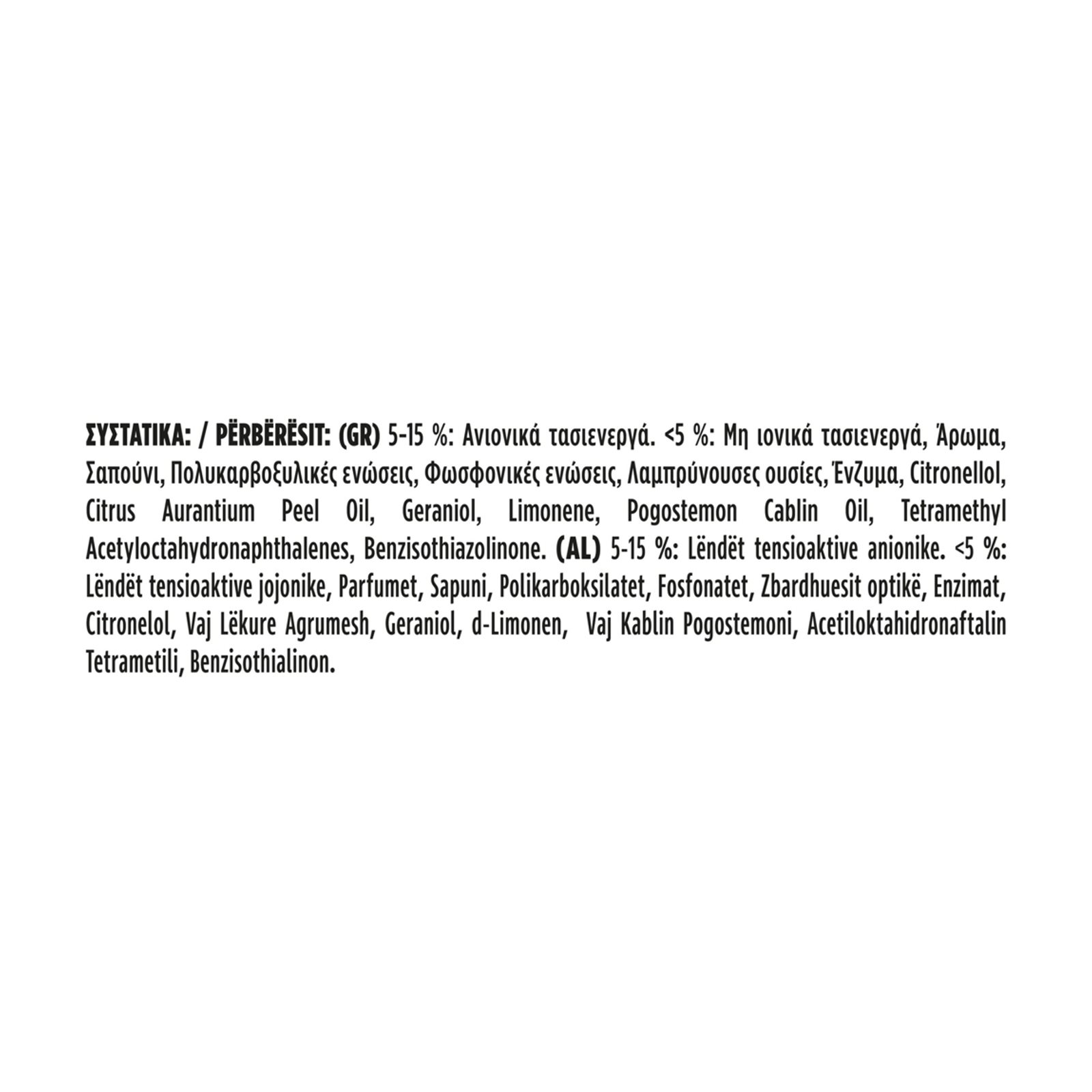 5-15% ανιονικά τασιενεργά, <5% Μη ιονικά τασιενεργά, Άρωμα, Σαπούνι, Πολυκαρβοξυλικές ενώσεις, Φωσφονικές ενώσεις, Λαμπρύνουσες ουσίες, Ένζυμα, Citronellol, Citrus Aurantium Peel Oil, Geraniol, Limonene, Pogostemon Cablin Oil, Tetramethyl Acetyloctahydronaphthalenes, Benzisothiazolinone.