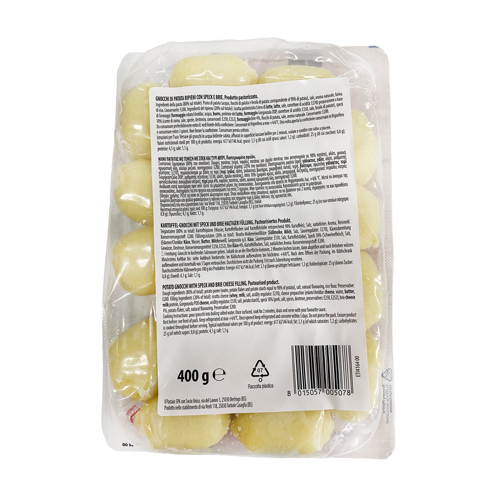 Συστατικά γέμισης (20% του συνόλου): Παστεριωμένη ρικότα (ορός ΓΑΛΑΚΤΟΣ, ΓΑΛΑ, αλάτι, ρυθμιστής οξύτητας: Ε270), παρασκεύασμα με βάση το τυρί [ΤΥΡΙ (ΓΑΛΑ, αλάτι, γαλακτικά βακτήρια, μικροβιακή πυτιά), νερό, ΒΟΥΤΥΡΟ, πρωτεΐνη ΓΑΛΑΚΤΟΣ, ΤΥΡΙ Γκοργκοντζόλα DOP, ρυθμιστής οξύτητας: Ε330, αλάτι, άμυλο πατάτας], σπεκ 10% (χοιρινό κρέας, αλάτι, μπαχαρικά, δεξτρόζη, συντηρητικό: νιτρώδες νάτριο, αντιοξειδωτικό: ασκορβικό νάτριο), ΤΥΡΙ μπρι 4%, νιφάδες πατάτας, αλάτι, φυσική αρωματική ύλη, συντηρητικά: Ε200.