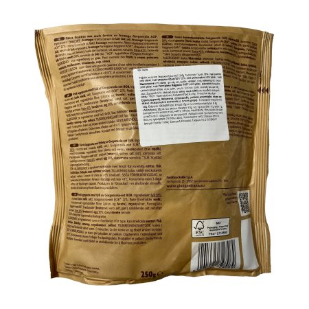 Γέμιση 58%: TΥΡΙ ρικότα (από ΓΑΛΑ), ΤΥΡΙ γκοργκοντζόλα ΠΟΠ* 22% (από ΓΑΛΑ), κρέμα (από ΓΑΛΑ), ΤΥΡΙ Mascarrpone (από ΓΑΛΑ), φυτικές ίνες (ραδίκι, ΣΙΤΑΡΙ), ορός ΓΑΛΑΚΤΟΣ σε σκόνη (από ΓΑΛΑ), ΤΥΡΙ Parmigiano Reggiano ΠΟΠ* (από ΓΑΛΑ), φρυγανιά τριμμένη (μαλακό αλεύρι ΣΙΤΟΥ, νερό, αλάτι, μαγιά), ηλιέλαιο, αλάτι, φυσικές αρωματικές ύλες.