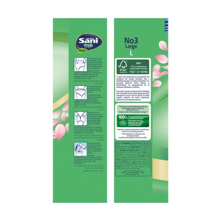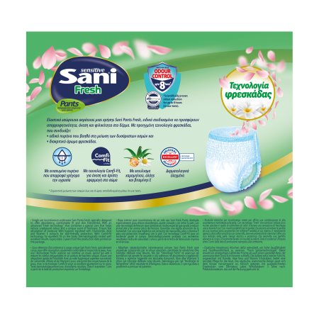 Ελαστικά εσώρουχα ακράτειας Sani Pants Fresh, ειδικά σχεδιασμένα να προσφέρουν απορροφητικότητα, άνεση και φιλικότητα στο δέρμα. Κατάλληλα για κινητικούς χρήστες με μεσαία και βαριά ακράτεια. Με προηγμένη τεχνολογία φρεσκάδας, που συνδυάζει ειδικό πυρήνα που εγκλωβίζει τις δυσάρεστες οσμές και διακριτικό άρωμα αίσθηση φρεσκάδας που διαρκεί. Με extra dry πυρήνα που συγκρατεί αποτελεσματικά ακόμη και μεγάλη ποσότητα υγρασίας, προσφέροντας προστασία από διαρροές και τη στεγνότητα που χρειάζεται το δέρμα. Με ειδική τεχνολογία Odour Control στον πυρήνα, για αποδεδειγμένο περιορισμό των οσμών για έως και 8 ώρες. Επιπλέον, χάρη στον λεπτό, ανατομικό σχεδιασμό τους και την ελαστικότητα Comfi-Fit, εξασφαλίζουν άνεση σε κάθε κίνηση και άριστη εφαρμογή στο σώμα. Με υγιεινό υφασμάτινο κάλυμμα, με εκχύλισμα χαμομηλιού, αλόης και βιταμίνης Ε για extra Sensitive προστασία στο δέρμα.