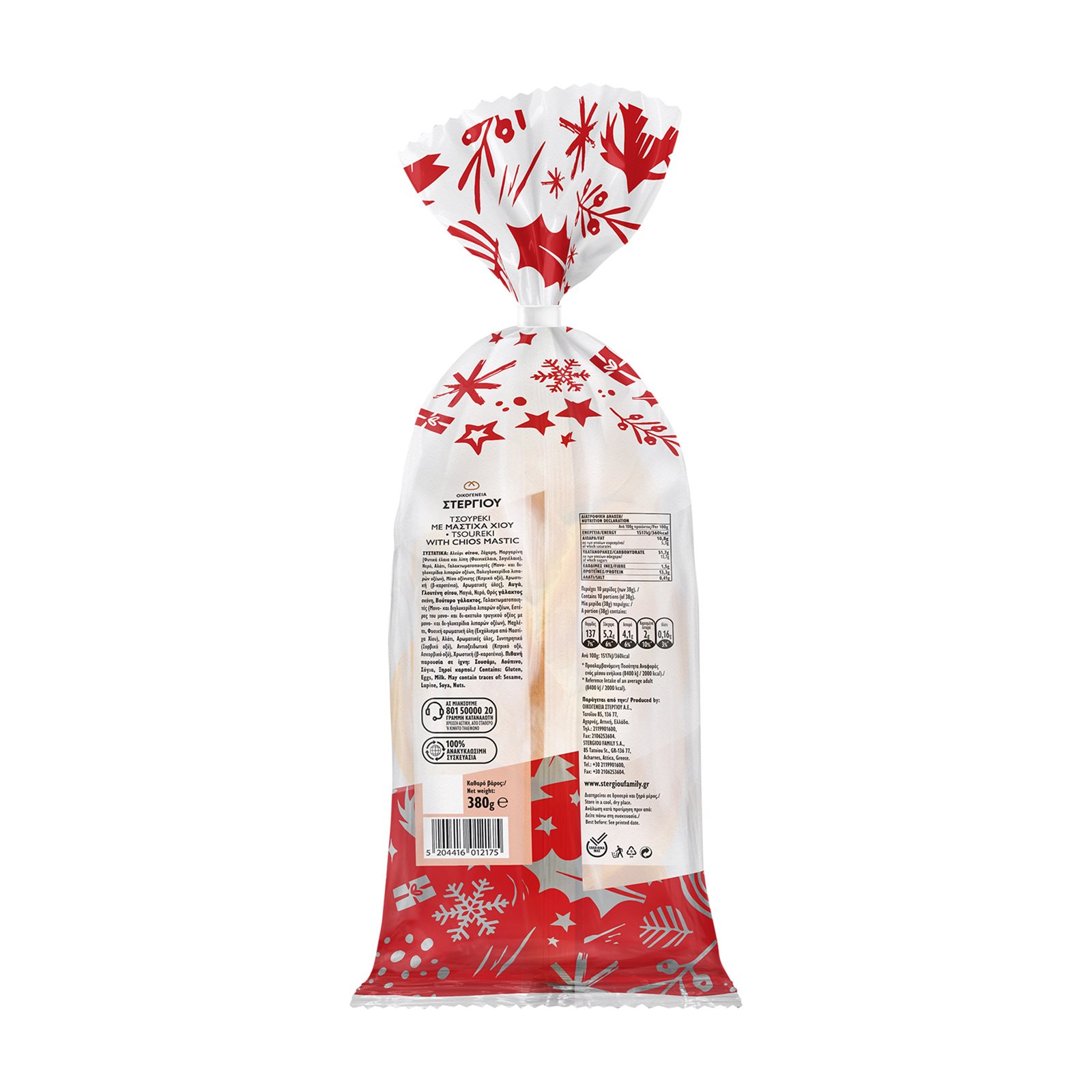 Αλεύρι ΣΙΤΟΥ, Ζάχαρη, Μαργαρίνη [Φυτικά έλαια και λίπη (Φοινικέλαιο, Σογιέλαιο), Νερό, Αλάτι, Γαλακτωματοποιητές (Μονο- και διγλυκερίδια λιπαρών οξέων, Πολυγλυκερίδια λιπαρών οξέων), Μέσο οξίνισης (Κιτρικό οξύ), Χρωστική (β-καροτένιο), Αρωματικές ύλες], ΑΥΓΑ, ΓΛΟΥΤΕΝΗ ΣΙΤΟΥ, Μαγιά, Νερό, Ορός ΓΑΛΑΚΤΟΣ σκόνη, Βούτυρο ΓΑΛΑΚΤΟΣ, Γαλακτωματοποιητές (Μονο- και διγλυκερίδια λιπαρών οξέων, Εστέρες του μονο- και δι-ακετυλο τρυγικού οξέος με μονο- και δι-γλυκερίδια λιπαρών οξέων), Μαχλέπι, Φυσική αρωματική ύλη (Εκχύλισμα από Μαστίχα Χίου), Αλάτι, Αρωματικές ύλες, Συντηρητικό (Σορβικό οξύ), Αντιοξειδωτικά (Κιτρικό οξύ, Ασκορβικό οξύ), Χρωστική (β-καροτένιο).