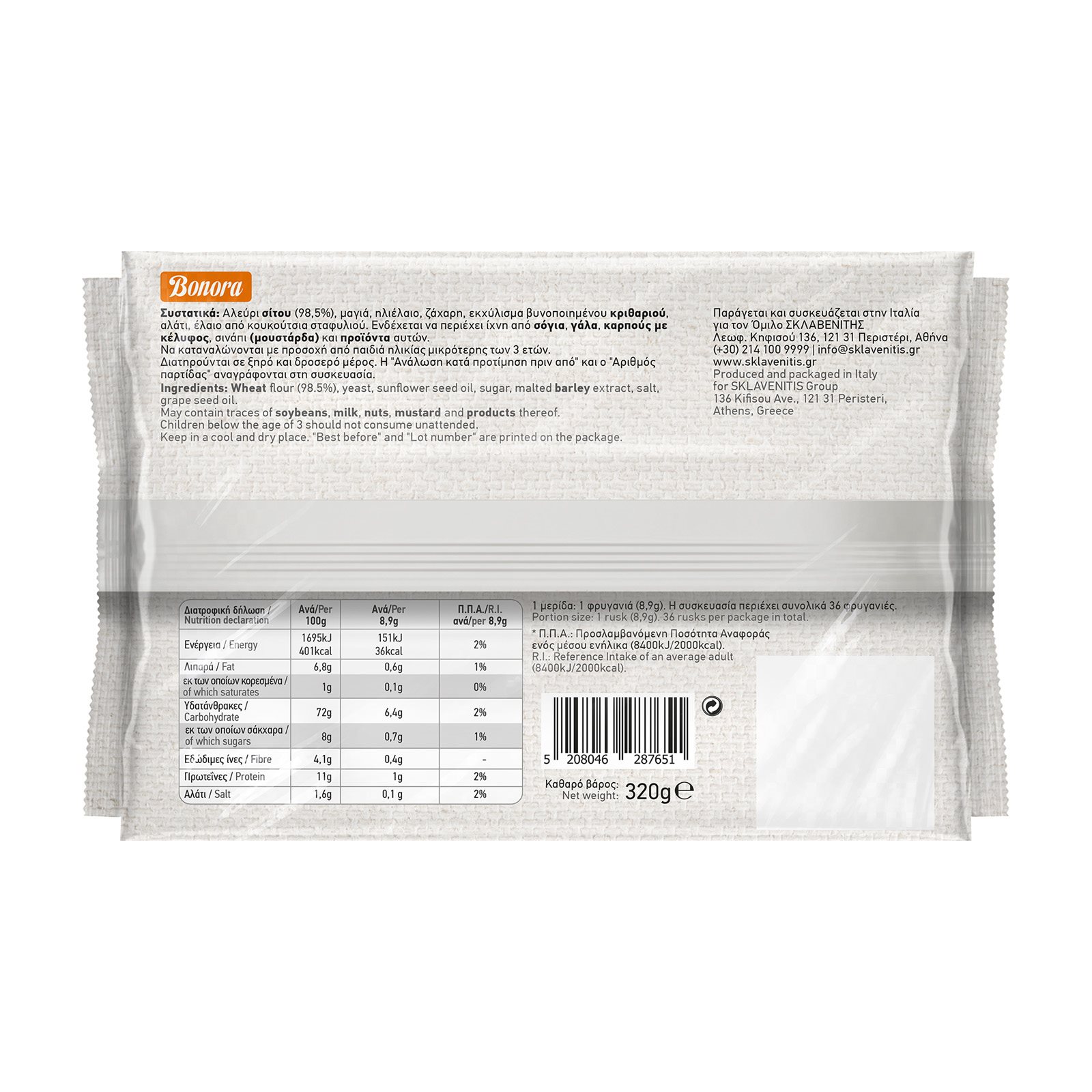 1 μερίδα: 1 φρυγανιά (8,9g). Η συσκευασία περιέχει συνολικά 36 φρυγανιές. |