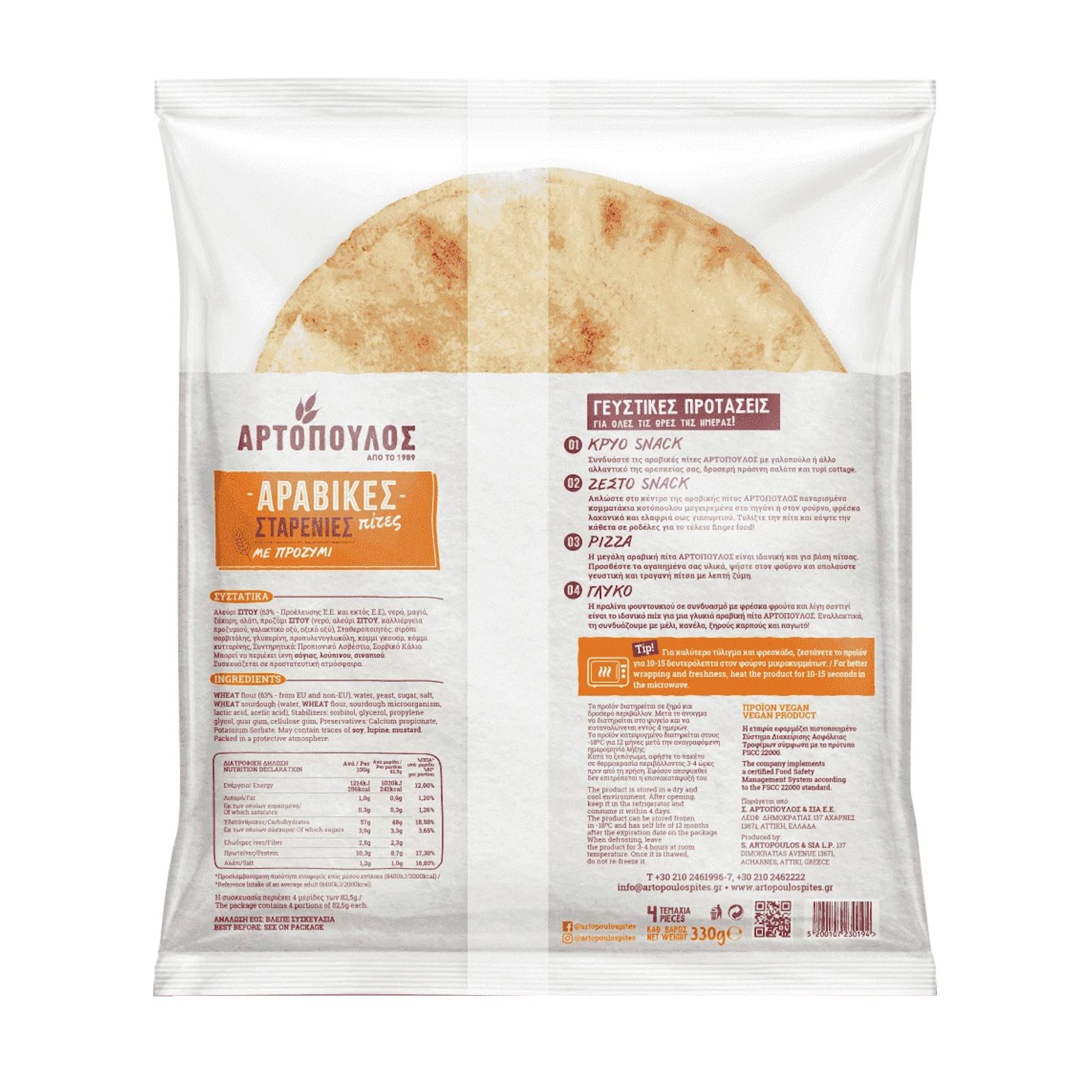 ΑΡΤΟΠΟΥΛΟΣ Αραβικές Πίτες Σταρένιες με Προζύμι Vegan 4τεμ 330g