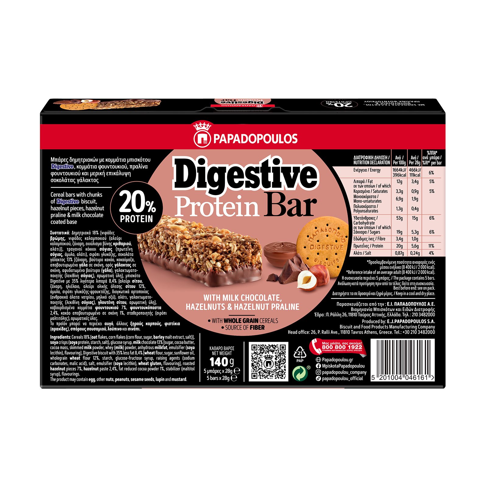 Δημητριακά 18% [νιφάδες ΒΡΩΜΗΣ, νιφάδες καλαμποκιού (αλεύρι καλαμποκιού, ζάχαρη, εκχύλισμα βύνης ΚΡΙΘΑΡΙΟΥ, αλάτι)], τραγανοί κόκκοι ΣΟΓΙΑΣ (πρωτεΐνη ΣΟΓΙΑΣ, άμυλο, αλάτι), σιρόπι γλυκόζης, σοκολάτα ΓΑΛΑΚΤΟΣ 13% [ζάχαρη, βούτυρο κακάο, κακαόμαζα, αποβουτυρωμένο ΓΑΛΑ σε σκόνη. ορός ΓΑΛΑΚΤΟΣ σε σκόνη, αφυδατωμένο βούτυρο (ΓΑΛΑ), γαλακτωματοποιητής (λεκιθίνη ΣΟΓΙΑΣ), αρωματική ύλη], μπισκότο Digestive με 35% λιγότερα λιπαρά 8,4% [αλεύρι ΣΙΤΟΥ, ζάχαρη, ηλιέλαιο, αλεύρι ολικής άλεσης ΣΙΤΟΥ 12%, άμυλο, σιρόπι γλυκόζης-φρουκτόζης, διογκωτικά αρτοποιίας (ανθρακικά άλατα νατρίου, μηλικό οξύ), αλάτι, γαλακτωματοποιητής (λεκιθίνη ΣΟΓΙΑΣ), γλουτένη ΣΙΤΟΥ, αρωματική ύλη], καβουρδισμένα κομμάτια ΦΟΥΝΤΟΥΚΙΟΥ 7%, ΦΟΥΝΤΟΥΚΟΠΑΣΤΑ 2,4%, κακάο αποβουτυρωμένο σε σκόνη 1%, σταθεροποιητής (σιρόπι μαλτιτόλης), αρωματικές ύλες.