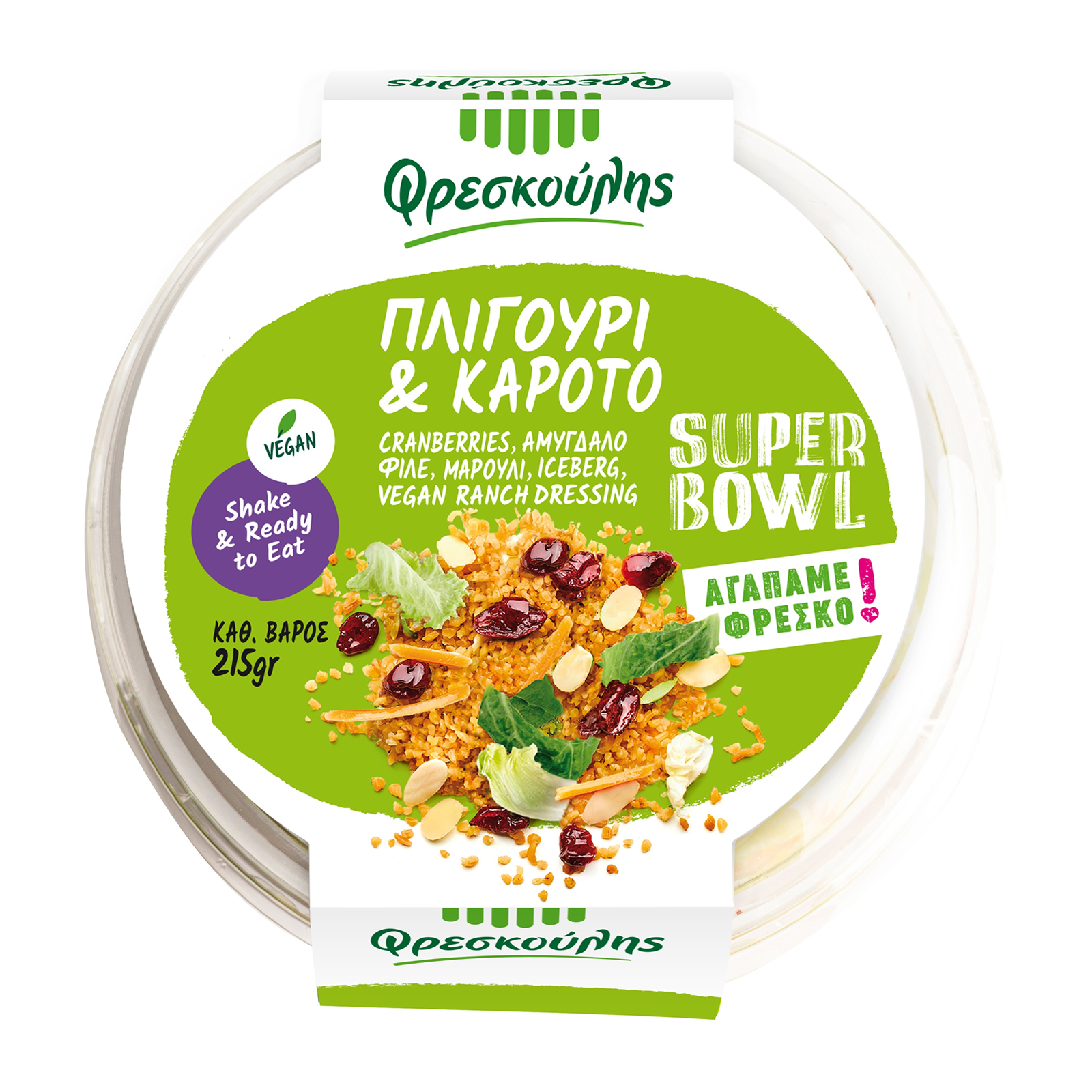 Πλιγούρι 26% (ΓΛΟΥΤΕΝΗ), iceberg 21%, καρότο 14%, vegan ranch dressing 14% {μαγιονέζα [νερό, φυτικό έλαιο (ηλιέλαιο 28%), ζάχαρη, τροποποιημένο άμυλο, αλάτι, ξίδι από σταφύλια, άρτυμα λεμονιού, σινάπι, μέσο οξίνισης (κιτρικό οξύ), σταθεροποιητές (κόμμι γκουάρ, ξανθανικό κόμμι), συντηρητικά (σορβικό κάλιο, βενζοϊκό νάτριο)], salad cream {νερό, μηλόξιδο (περιέχει ΘΕΙΩΔΗ), σογιέλαιο, ζάχαρη, άμυλο αραβοσίτου, ΜΟΥΣΤΑΡΔΑ [νερό, σιναπόσπορος, άμυλο αραβοσίτου, αλάτι, σιρόπι γλυκόζης-φρουκτόζης, συντηρητικό (σορβικό κάλιο), ρυθμιστής οξύτητας (οξικό οξύ), σταθεροποιητής (κόμμι ξανθάνης), αρωματικές ύλες, χρωστική (κουρκουμίνη), γλυκαντικό (σακχαρίνη)], αλάτι}, νερό, αλάτι, συντηρητικό (σορβικό κάλιο), σταθεροποιητής (κόμμι ξανθάνης), αρωματικές ύλες, ρυθμιστής οξύτητας (διάλυμα οξικού οξέος), χρωστική (κουρκουμάς), γλυκαντικό (σακχαρίνη)], αλάτι}, νερό, αλάτι, κρεμμύδι, σκόρδο, κύμινο, άνηθος, πιπέρι}, μαρούλι 11%, cranberries 7% (cranberry 60%, ζάχαρη, ηλιέλαιο), αμύγδαλο φιλέ 7%.