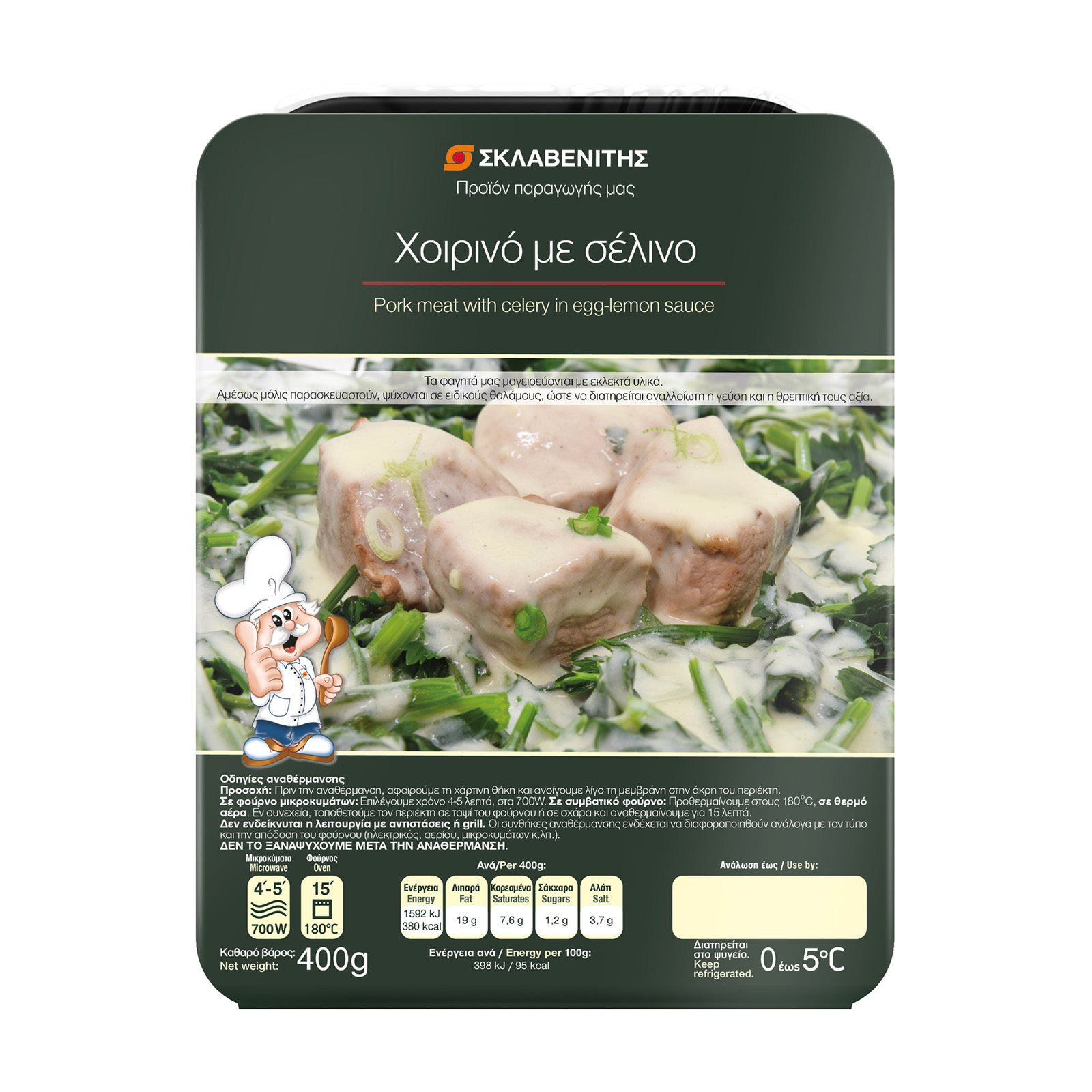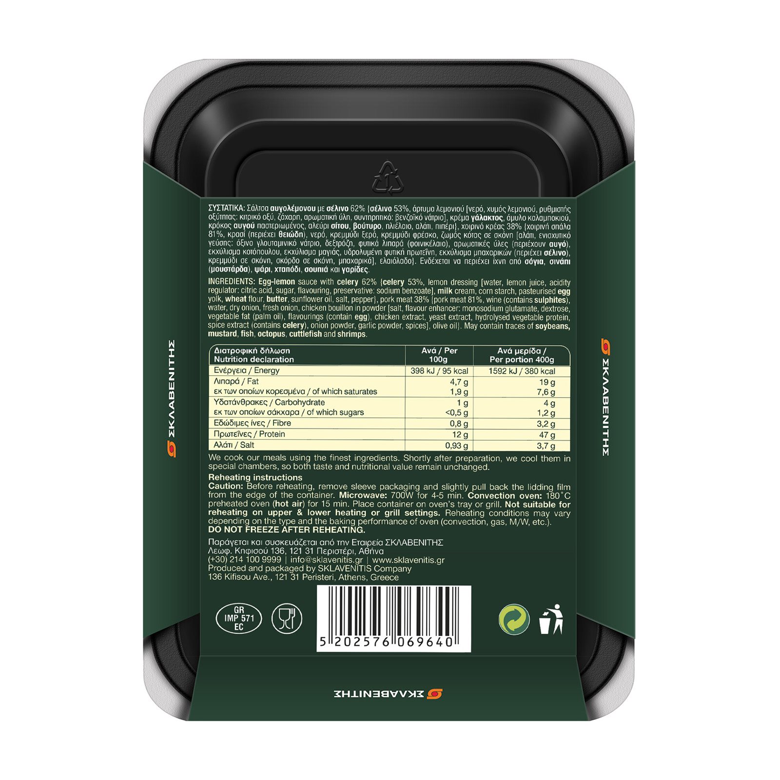 Σάλτσα ΑΥΓΟΛΕΜΟΝΟΥ με ΣΕΛΙΝΟ 62% (ΣΕΛΙΝΟ 53%, άρτυμα λεμονιού (νερό, χυμός λεμονιού, ρυθμιστής οξύτητας: κιτρικό οξύ, ζάχαρη, αρωματική ύλη, συντηρητικό: βενζοϊκό νάτριο), κρέμα ΓΑΛΑΚΤΟΣ, άμυλο καλαμποκιού, κρόκος ΑΥΓΟΥ παστεριωμένος, αλεύρι ΣΙΤΟΥ, ΒΟΥΤΥΡΟ, ηλιέλαιο, αλάτι, πιπέρι), χοιρινό κρέας 38% (χοιρινή σπάλα 81%, κρασί (περιέχει ΘΕΙΩΔΗ), νερό, κρεμμύδι ξερό, κρεμμύδι φρέσκο, ζωμός κότας σε σκόνη (αλάτι, ενισχυτικό γεύσης: όξινο γλουταμινικό νάτριο, δεξτρόζη, φυτικά λιπαρά (φοινικέλαιο), αρωματικές ύλες (περιέχουν ΑΥΓΟ), εκχύλισμα κοτόπουλου, εκχύλισμα μαγιάς, υδρολυμένη φυτική πρωτεΐνη, εκχύλισμα μπαχαρικών (περιέχει ΣΕΛΙΝΟ), κρεμμύδι σε σκόνη, σκόρδο σε σκόνη, μπαχαρικά], ελαιόλαδο).