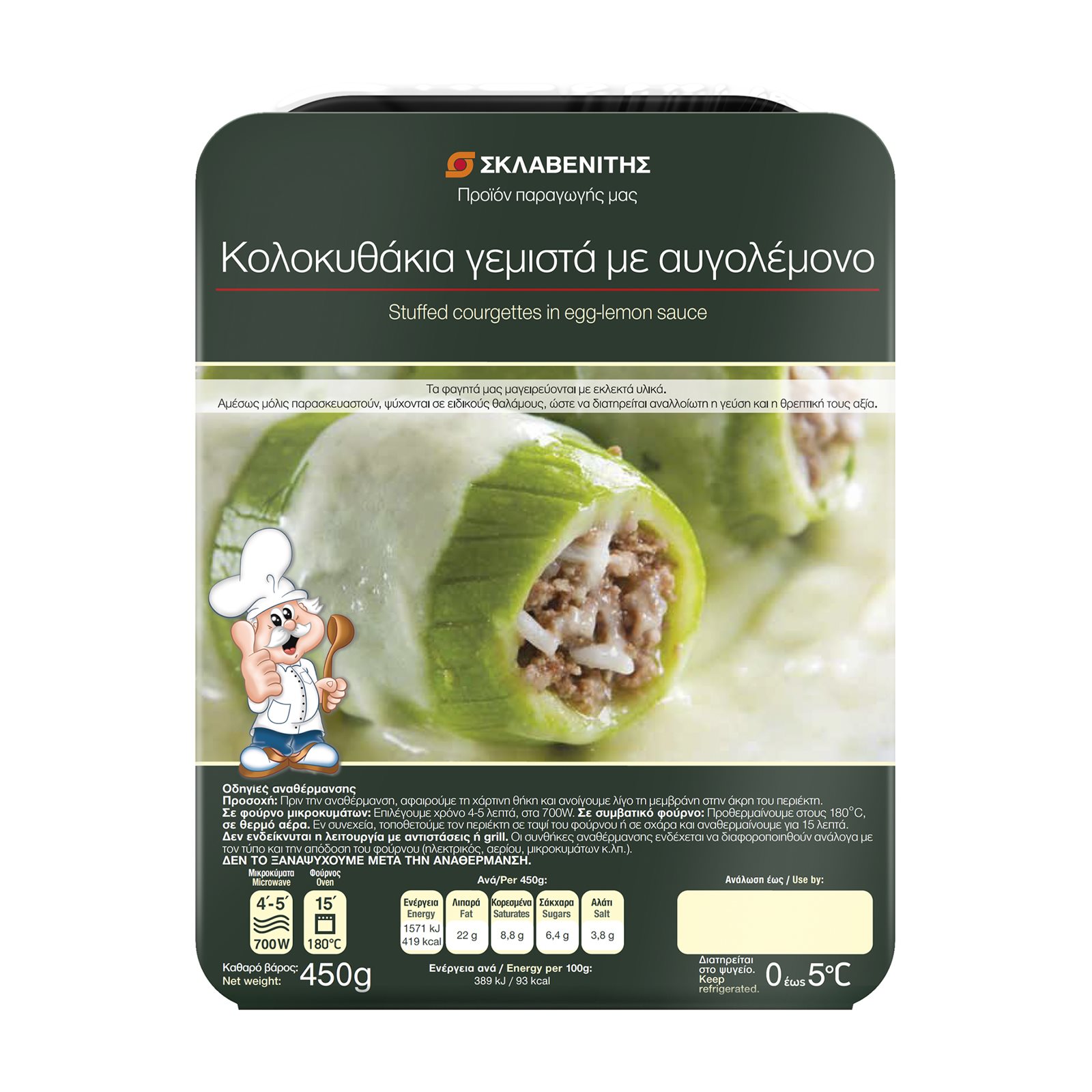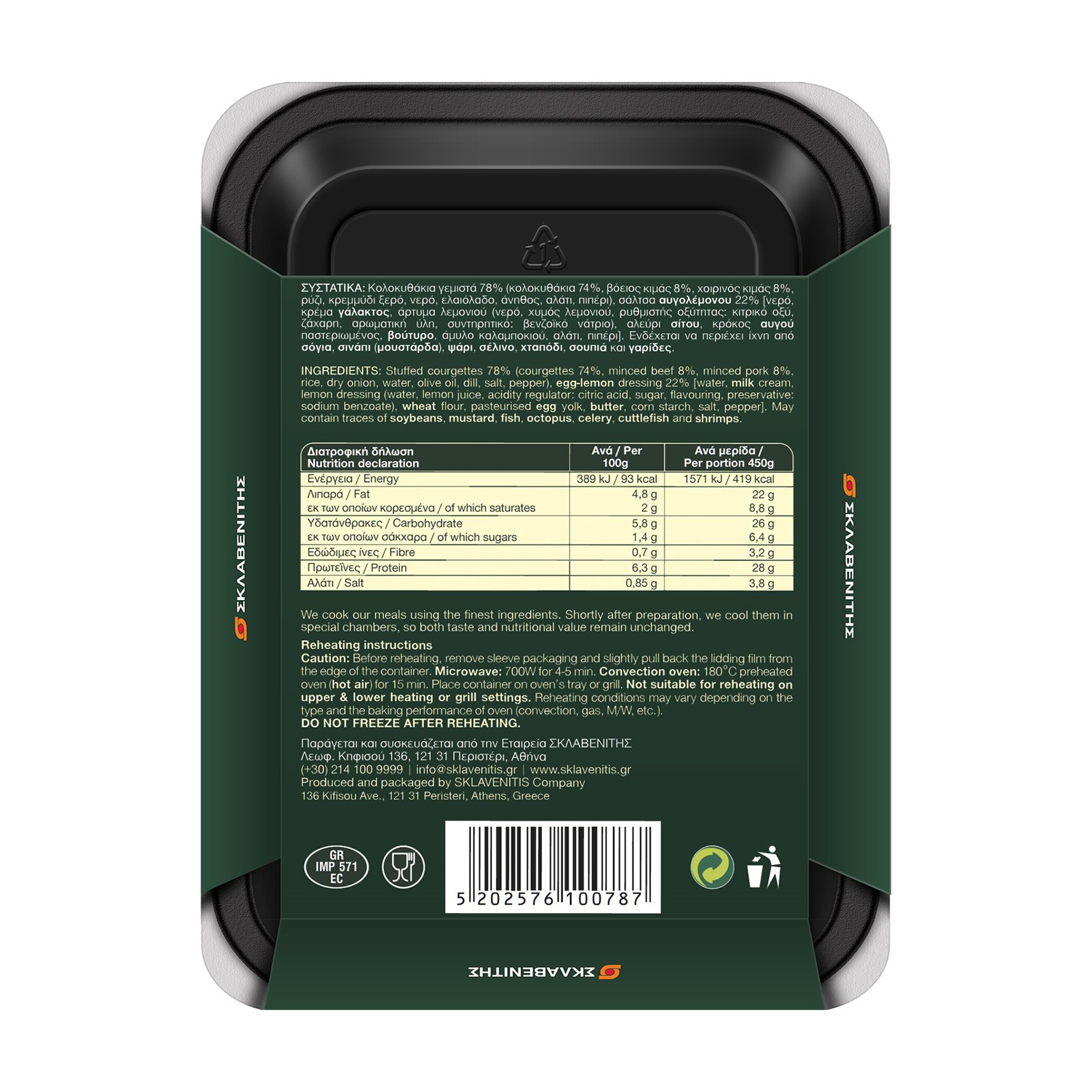 Κολοκυθάκια γεμιστά 78% (κολοκυθάκια 74%, βόειος κιμάς 8%, χοιρινός κιμάς 8%, ρύζι, κρεμμύδι ξερό, νερό, ελαιόλαδο, άνηθος, αλάτι, πιπέρι), σάλτσα ΑΥΓΟΛΕΜΟΝΟΥ 22% [νερό, κρέμα ΓΑΛΑΚΤΟΣ, άρτυμα λεμονιού (νερό, χυμός λεμονιού, ρυθμιστής οξύτητας: κιτρικό οξύ, ζάχαρη, αρωματική ύλη, συντηρητικό: βενζοϊκό νάτριο), αλεύρι ΣΙΤΟΥ, κρόκος ΑΥΓΟΥ παστεριωμένος, ΒΟΥΤΥΡΟ, άμυλο καλαμποκιού, αλάτι, πιπέρι].