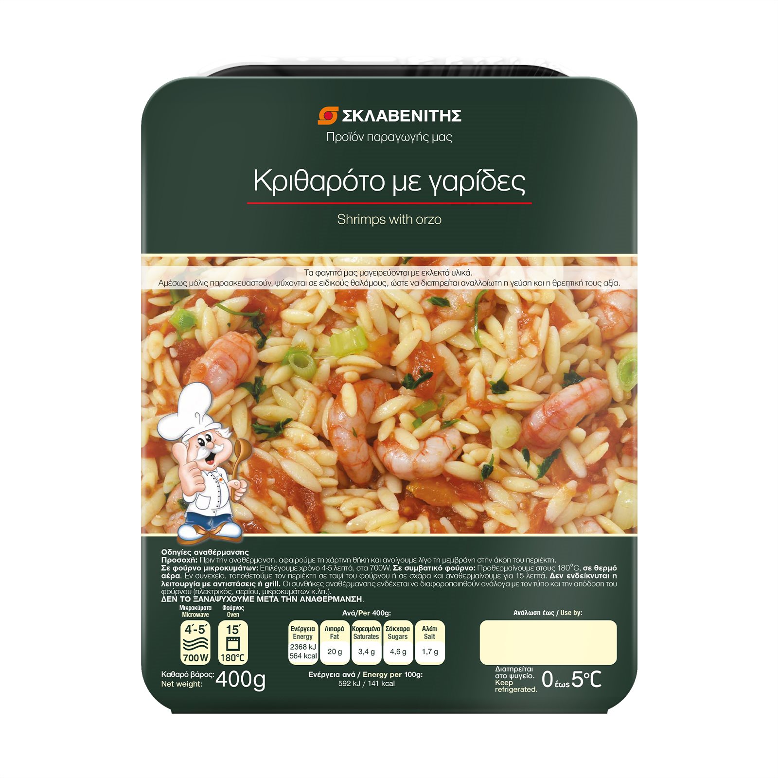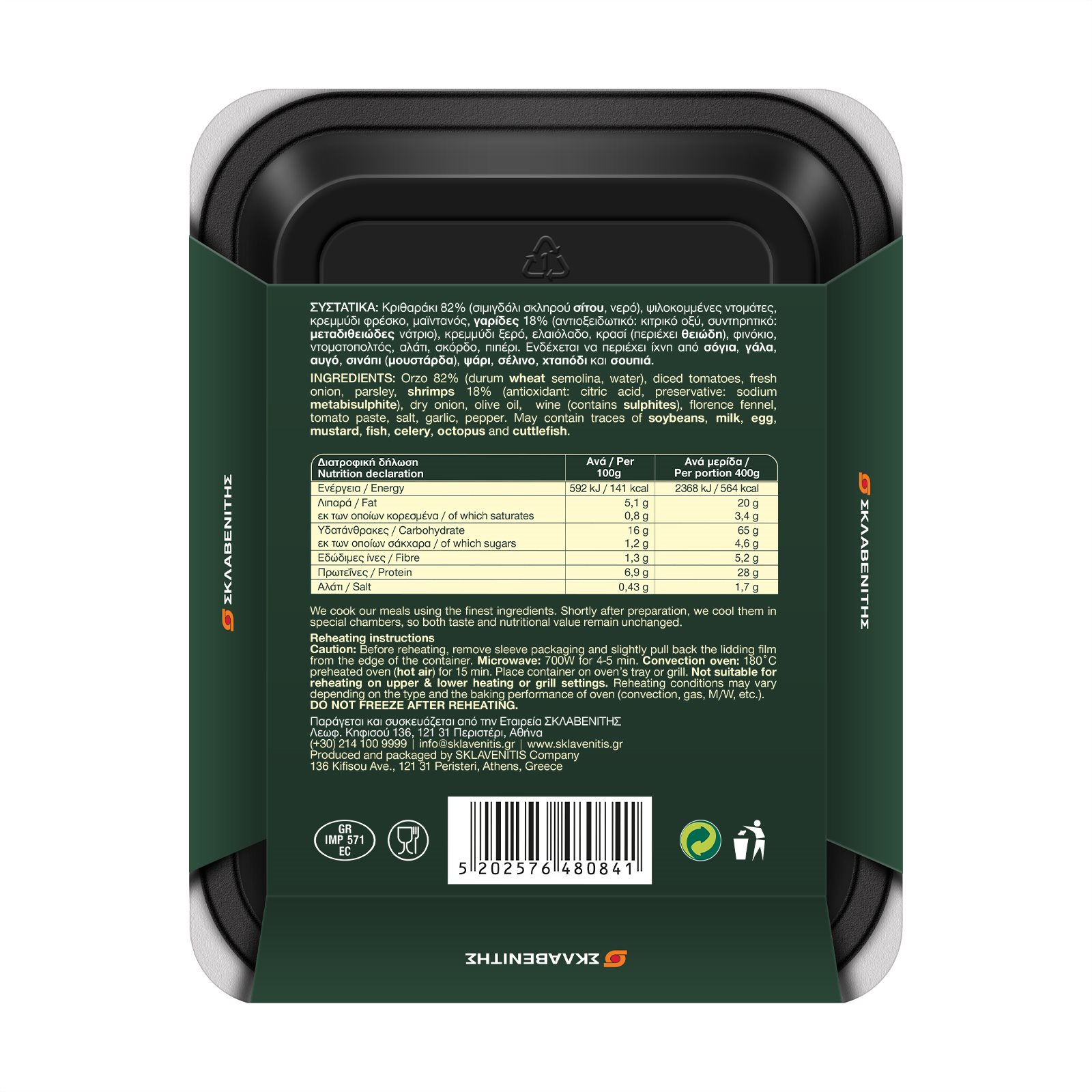 Κριθαράκι 82% (σιμιγδάλι σκληρού ΣΙΤΟΥ, νερό), ψιλοκομμένες ντομάτες, κρεμμύδι φρέσκο, μαϊντανός, ΓΑΡΙΔΕΣ 18% (αντιοξειδωτικό: κιτρικό οξύ, συντηρητικό: ΜΕΤΑΔΙΘΕΙΩΔΕΣ νάτριο), κρεμμύδι ξερό, ελαιόλαδο, κρασί (περιέχει ΘΕΙΩΔΗ), φινόκιο, ντοματοπολτός, αλάτι, σκόρδο, πιπέρι.