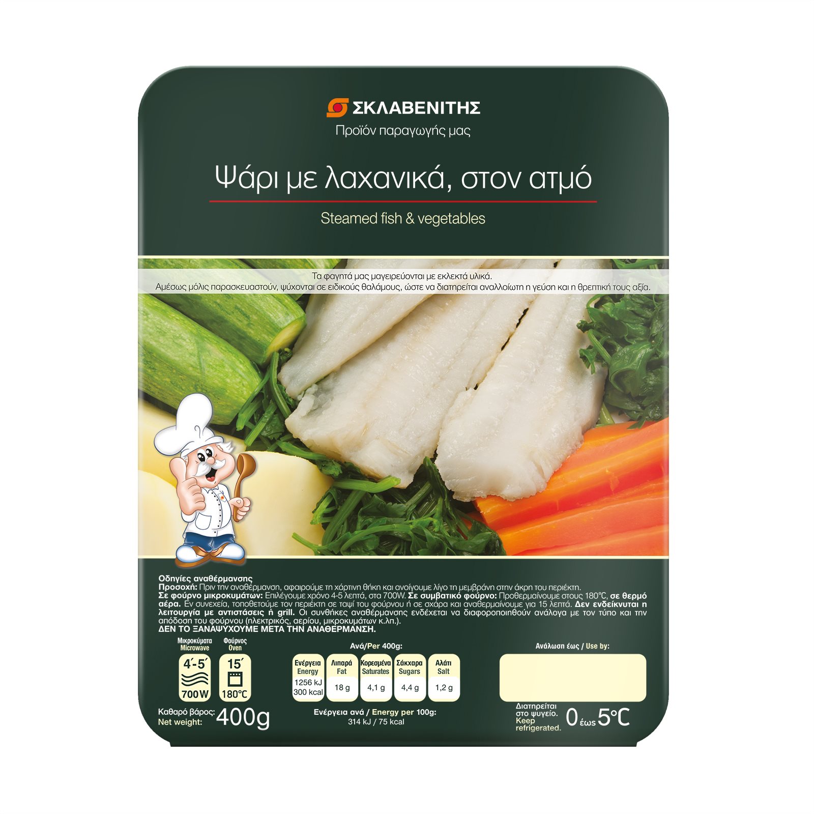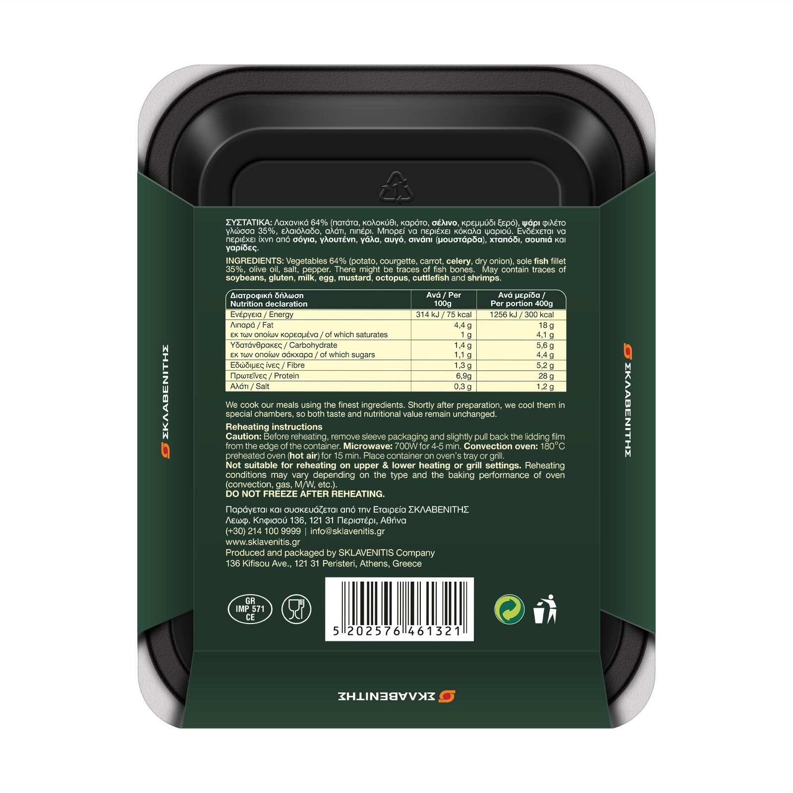 Λαχανικά 64% (πατάτα, κολοκύθι, καρότο, ΣΕΛΙΝΟ, κρεμμύδι ξερό), ΨΑΡΙ φιλέτο γλώσσα 35%, ελαιόλαδο, αλάτι, πιπέρι.