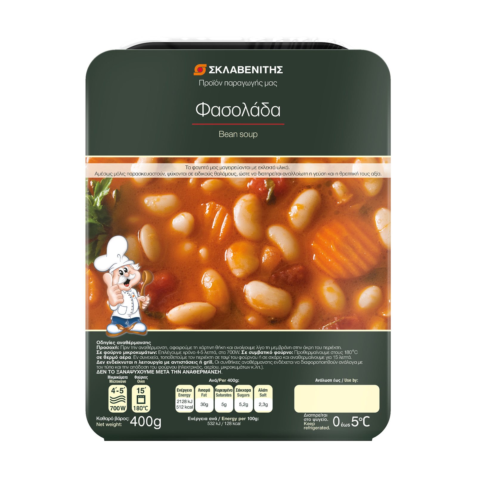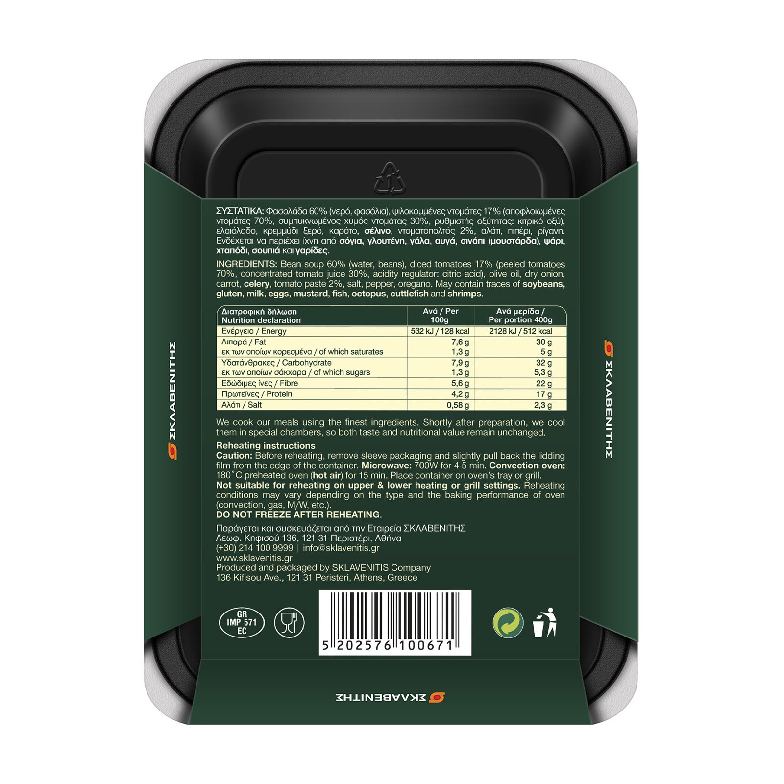 Φασολάδα 60% (νερό, φασόλια), ψιλοκομμένες ντομάτες 17% (αποφλοιωμένες ντομάτες 70%, συμπυκνωμένος χυμός ντομάτας 30%, ρυθμιστής οξύτητας: κιτρικό οξύ), ελαιόλαδο, κρεμμύδι ξερό, καρότο, ΣΕΛΙΝΟ, ντοματοπολτός 2%, αλάτι, πιπέρι, ρίγανη.