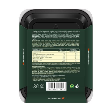Νερό, αρακάς 58%, καρότο, κρεμμύδι, ελαιόλαδο, αγκινάρες 35%, άρτυμα λεμονιού (νερό, χυμός λεμονιού, ρυθμιστής οξύτητας: κιτρικό οξύ, ζάχαρη, συντηρητικό: βενζοϊκό νάτριο, αρωματική ύλη), πατάτες 7%, άνηθος, αλάτι, νιφάδες πατάτας αφυδατωμένες [πατάτα, αντιοξειδωτικά (κιτρικό οξύ, παλμιτικό ασκορβύλιο), συντηρητικό: ΜΕΤΑΔΙΘΕΙΩΔΕΣ νάτριο, κουρκουμάς], πιπέρι.
