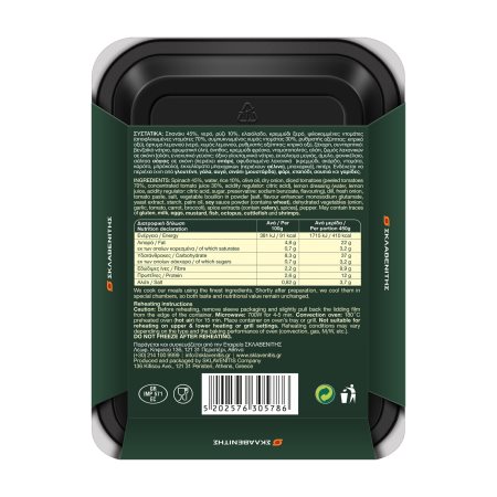 Σπανάκι 45%, νερό, ρύζι 10%, ελαιόλαδο, κρεμμύδι ξερό, ψιλοκομμένες ντομάτες, άρτυμα λεμονιού (νερό, χυμός λεμονιού, ρυθμιστής οξύτητας: κιτρικό οξύ, ζάχαρη, αρωματική ύλη, συντηρητικό: βενζοϊκό νάτριο), άνηθος, κρεμμύδι φρέσκο, ντοματοπολτός, αλάτι, ζωμός λαχανικών σε σκόνη [αλάτι, ενισχυτικό γεύσης: όξινο γλουταμινικό νάτριο, αρτύματα (περιέχουν ΣΟΓΙΑ, ΣΕΛΙΝΟ, καραμελωμένη ζάχαρη), εκχύλισμα μαγιάς, φυτικά λιπαρά σε σκόνη (φοινικέλαιο), εκχύλιασμα μπαχαρικών, (περιέχουν ΣΕΛΙΝΟ), κρεμμύδι σε σκόνη, σκόρδο σε σκόνη, μπαχαρικά], πιπέρι.
