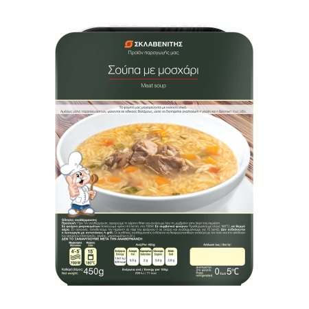 Νερό, κρέας νεαρού μόσχου 33%, καρότο, πατάτα, κολοκύθι, κρεμμύδι ξερό, ντομάτα, κριθαράκι (σιμιγδάλι σκληρού ΣΙΤΟΥ, νερό), ελαιόλαδο, αλάτι, ξίδι, ΣΕΛΙΝΟ, πιπέρι.