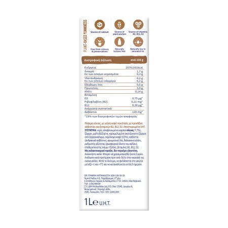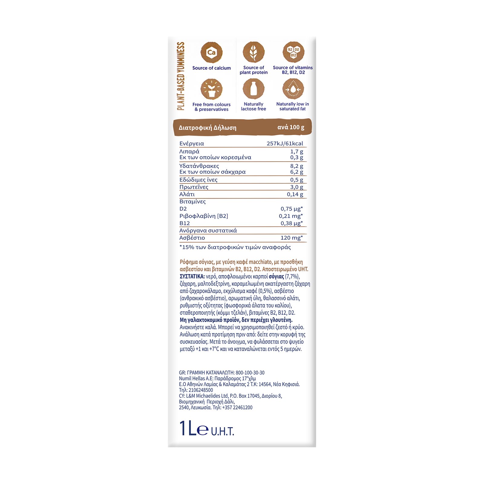 Ρόφημα σόγιας, με γεύση καφέ macchiato, με προσθήκη ασβεστίου και βιταμινών B2, B12, D2.