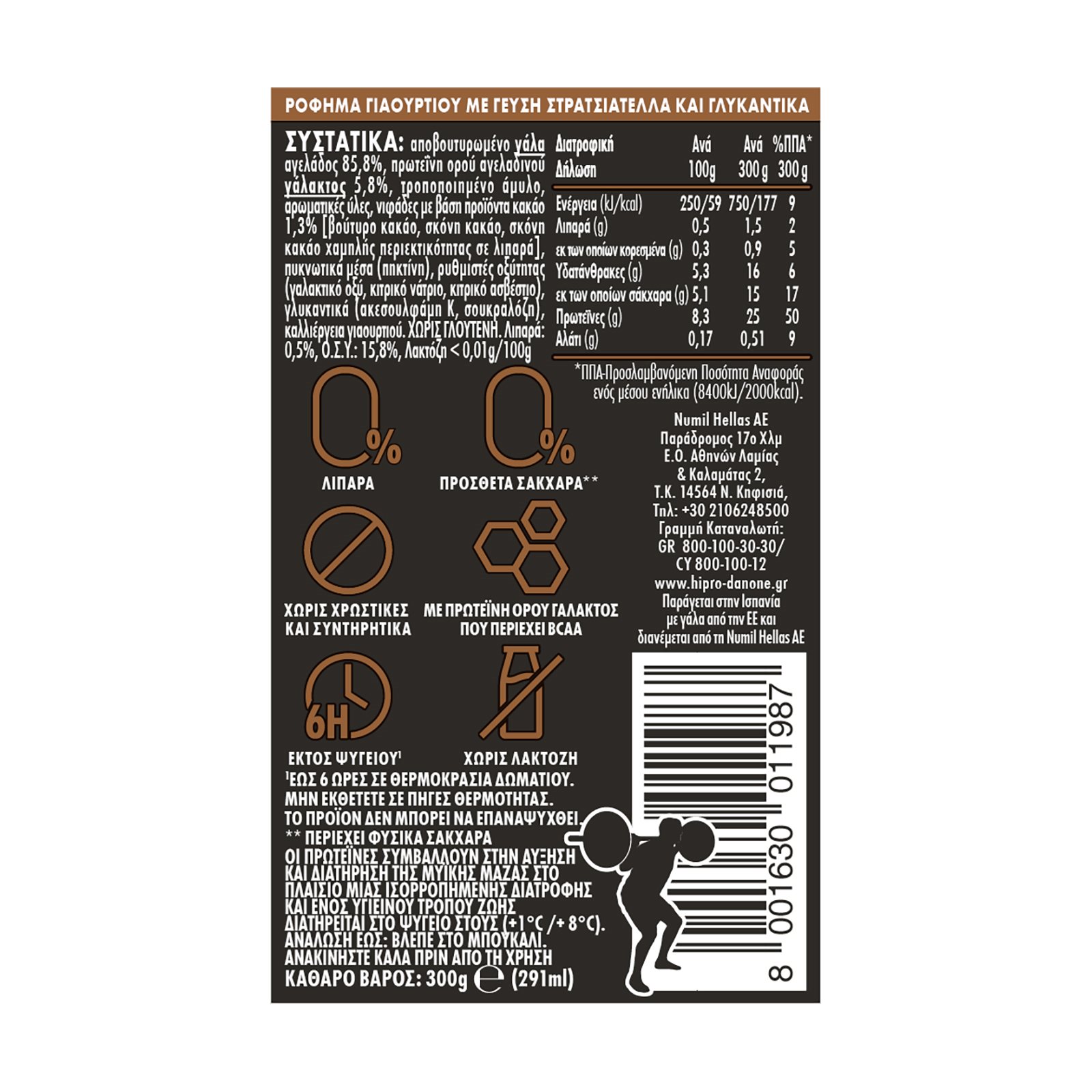 Αποβουτυρωμένο ΓΑΛΑ αγελάδος 85,8%, πρωτεΐνη ορού αγελαδινού ΓΑΛΑΚΤΟΣ 5,8%, τροποποιημένο άμυλο, αρωματικές ύλες, νιφάδες με βάση προϊόντα κακάο 1,3% [βούτυρο κακάο, σκόνη κακάο, σκόνη κακάο χαμηλής περιεκτικότητας σε λιπαρά], πυκνωτικά μέσα (πηκτίνη), ρυθμιστές οξύτητας (γαλακτικό οξύ, κιτρικό νάτριο, κιτρικό ασβέστιο), γλυκαντικά (ακεσουλφάμη Κ, σουκραλόζη), καλλιέγεια γιαουρτιού.