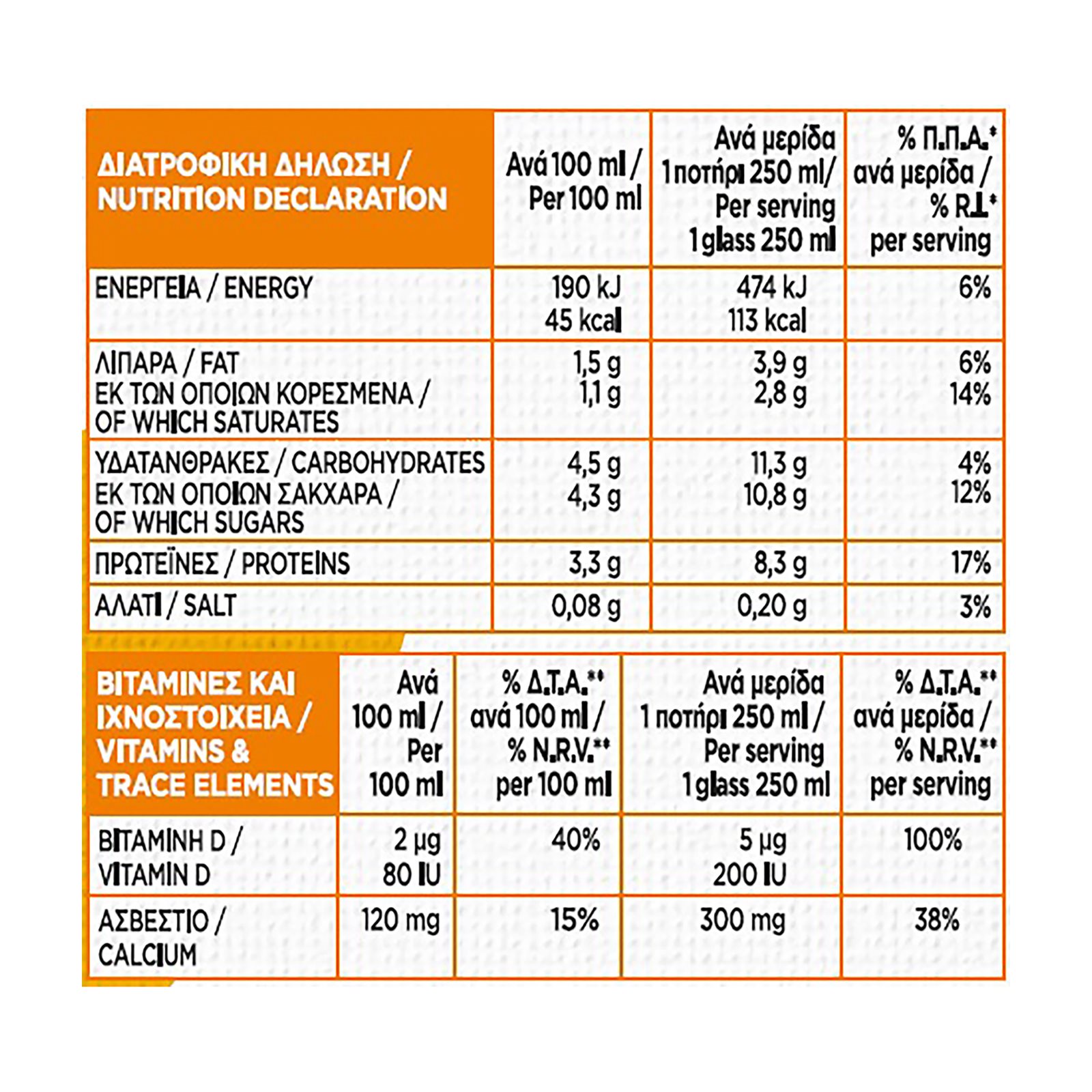 Ανά μερίδα 1 ποτήρι 250ml |