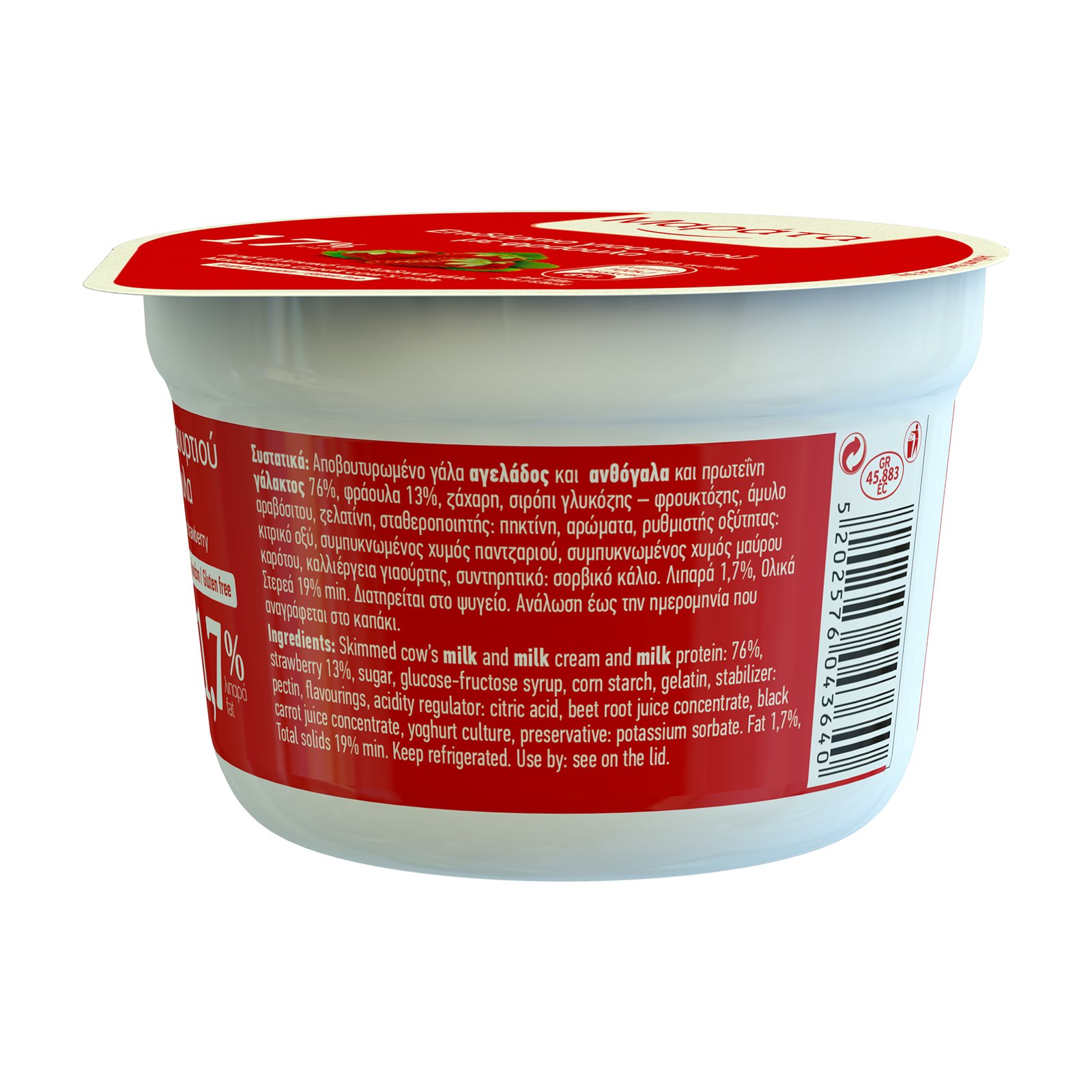 Λαχταριστό επιδόρπιο γιαουρτιού 1,7% λιπαρά με φράουλα, από Ελληνικό αγελαδινό γάλα.