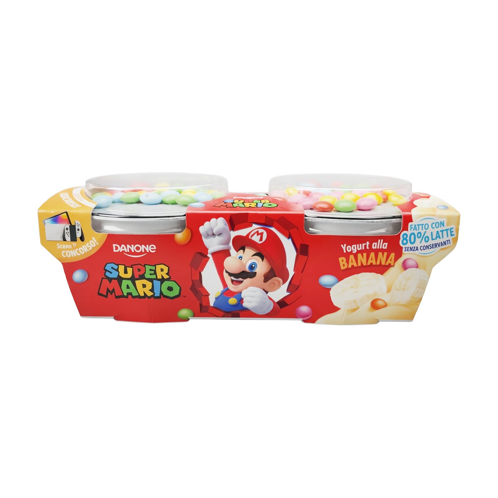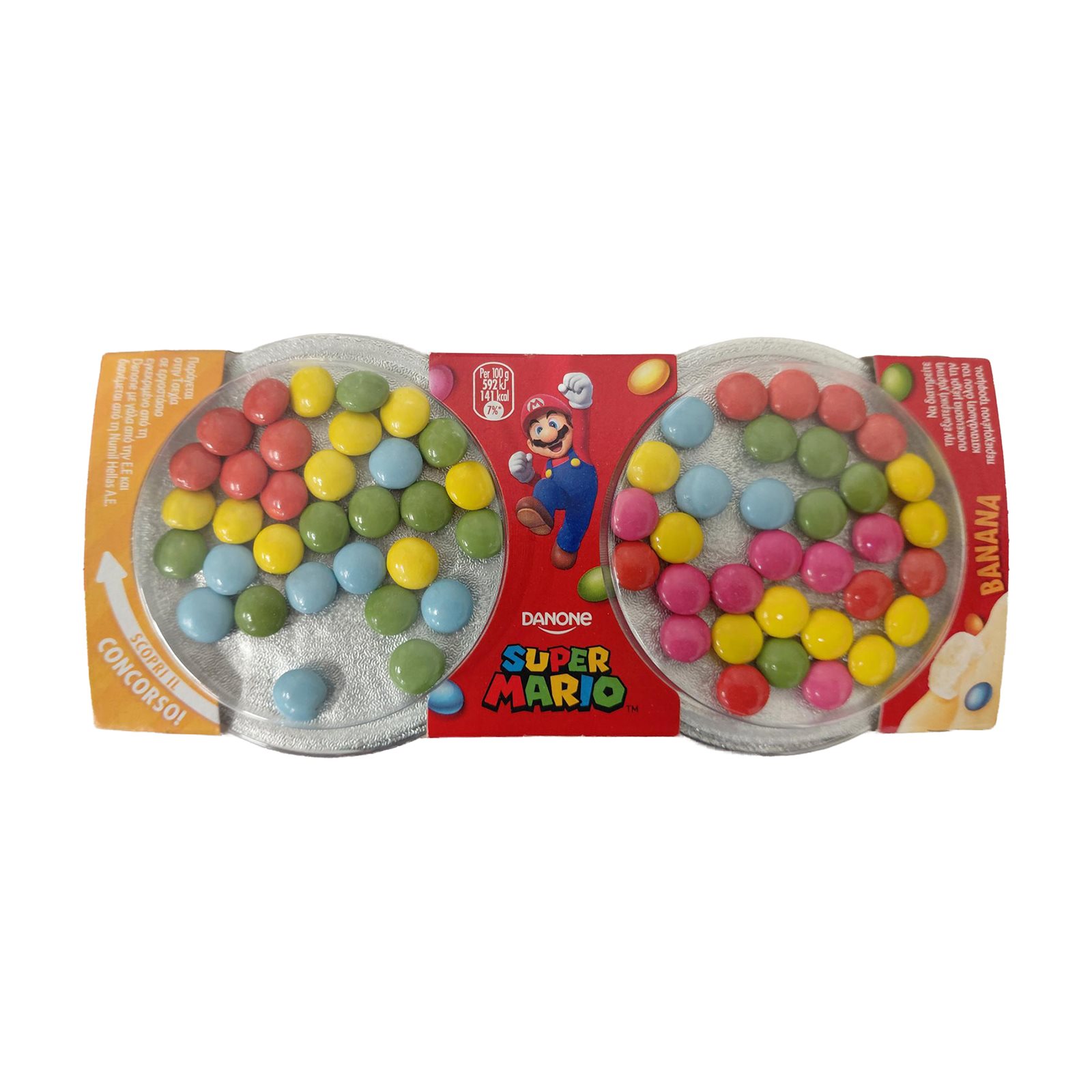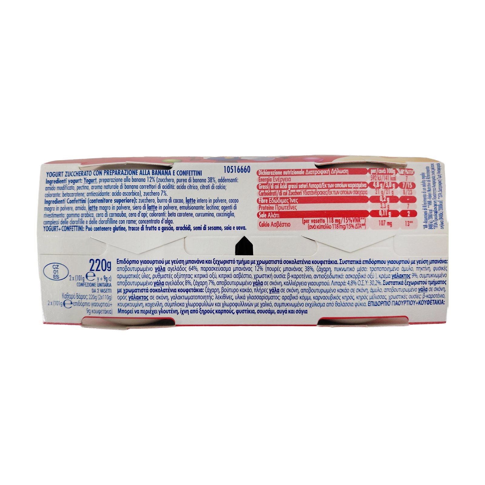 Επιδόρπιο γιαουρτιού με γεύση μπανάνα: αποβουτυρωμένο ΓΑΛΑ αγελάδος 64%, παρασκεύασμα μπανάνας 12% (πουρές μπανάνας 38%, ζάχαρη, πυκνωτικό μέσο: τροποποιημένο άμυλο, πηκτίνη, φυσικές αρωματικές ύλες, ρυθμιστές οξύτητας: κιτρικό οξύ, κιτρικό ασβέστιο, χρωστική ουσία: β-καροτένιο, αντιοξειδωτικό: ασκορβικό οξύ), κρέμα ΓΑΛΑΚΤΟΣ 9%, συμπυκνωμένο αποβουτυρωμένο ΓΑΛΑ αγελάδος 8%, ζάχαρη 7%, αποβουτυρωμένο ΓΑΛΑ σε σκόνη, καλλιέργεια γιαουρτιού. Λιπαρά: 4,8%, ΟΣΥ: 30,2%.