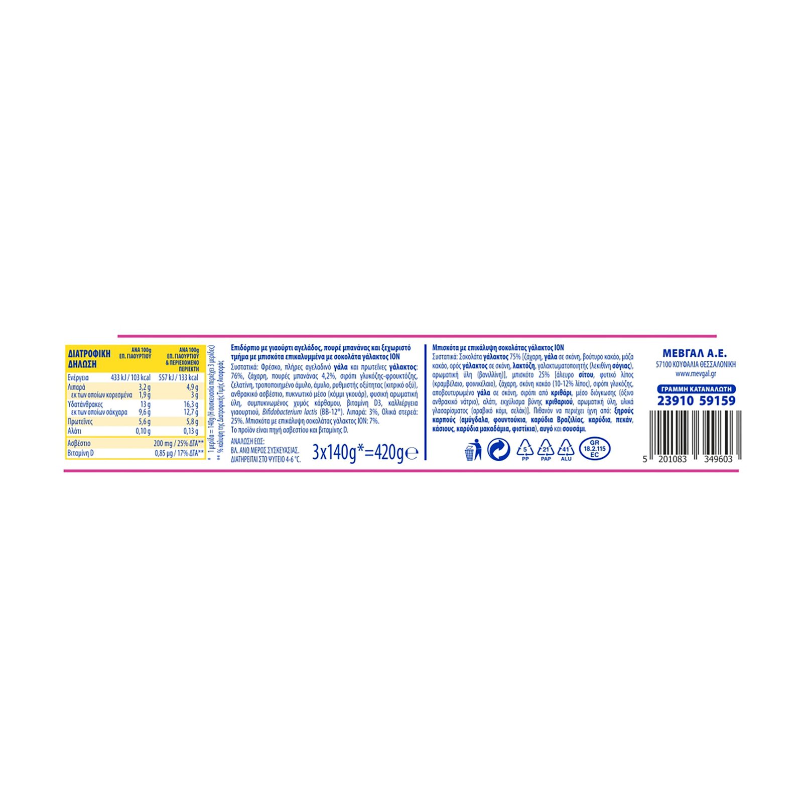 Επιδόρπιο: Φρέσκο, πλήρες αγελαδινό ΓΑΛΑ και πρωτεΐνες ΓΑΛΑΚΤΟΣ: 76%, ζάχαρη, πουρές μπανάνας 4,2%, σιρόπι γλυκόζης-φρουκτόζης, ζελατίνη, τροποποιημένο άμυλο, άμυλο, ρυθμιστής οξύτητας (κιτρικό οξύ), ανθρακικό ασβέστιο, πυκνωτικό μέσο (κόμμι γκουάρ), φυσική αρωματική ύλη, συμπυκνωμένος χυμός κάρθαμου, βιταμίνη D3, καλλιέργεια γιαουρτιού, Bifidobacterium loctis (BB-12).