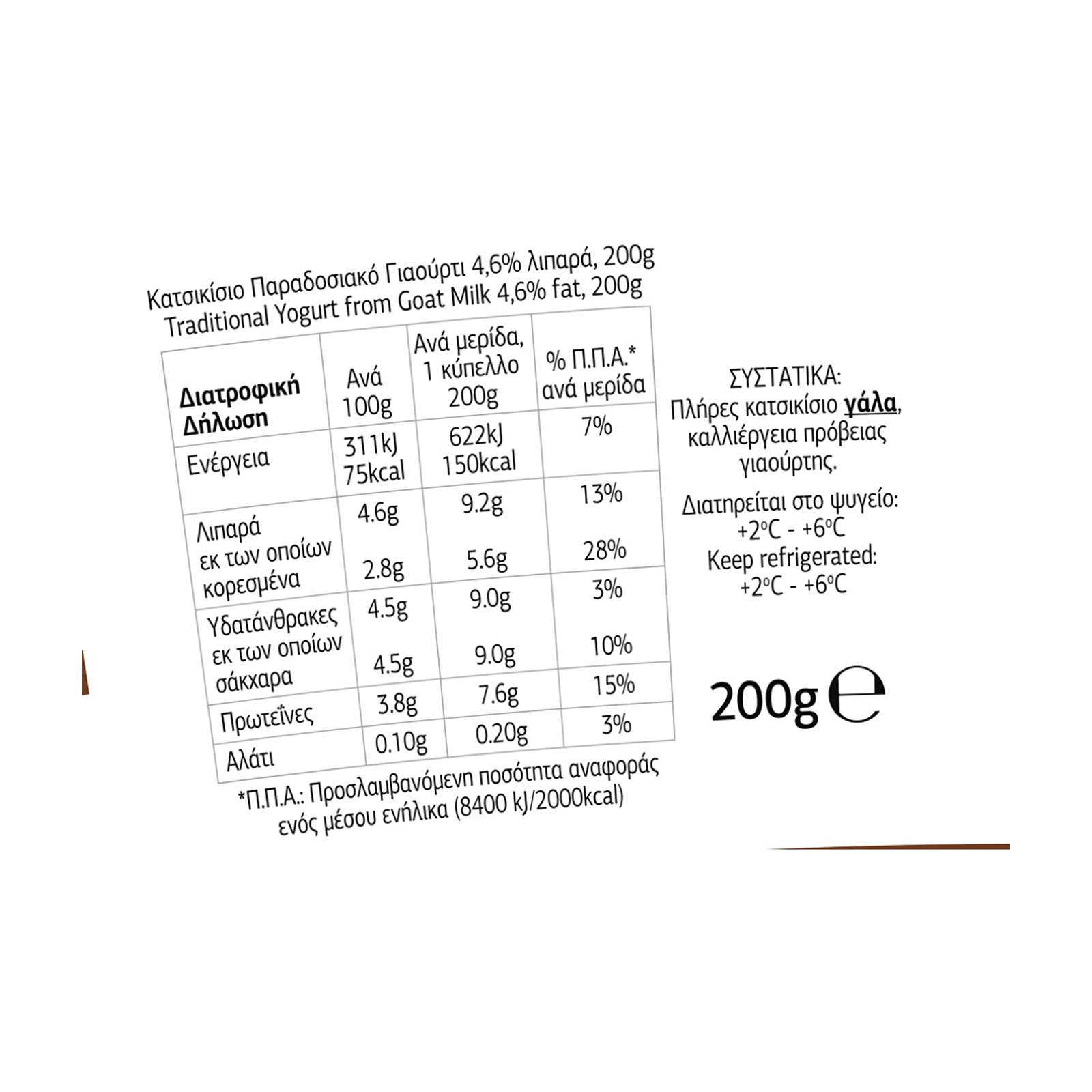 | Ανά 100g | Ανά μερίδα 1 κύπελλο 200g | Π.Π.Α.* ανά μερίδα | |