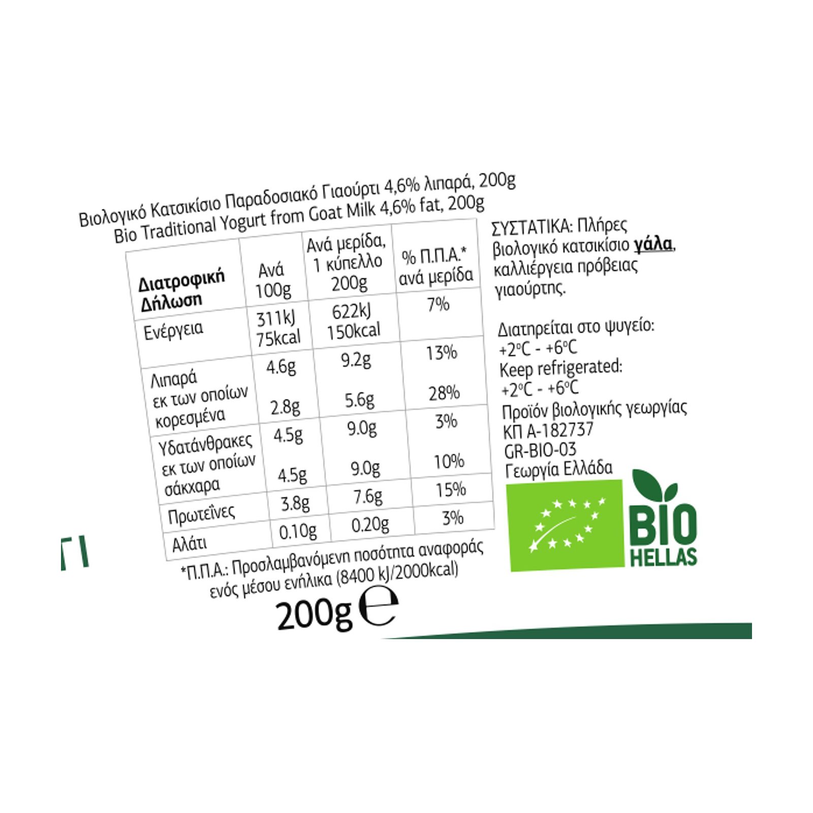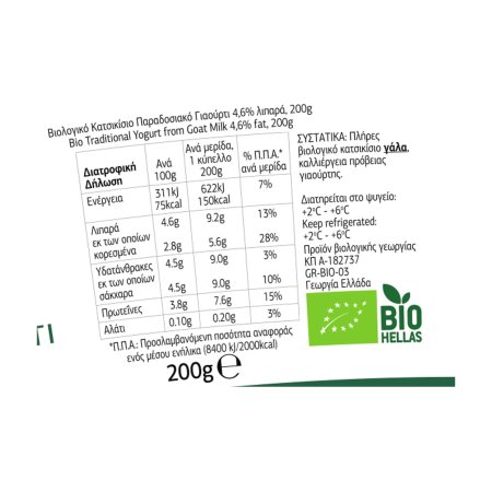 Βιολογικό κατσικίσιο παραδοσιακό γιαούρτι με 4,6% λιπαρά.