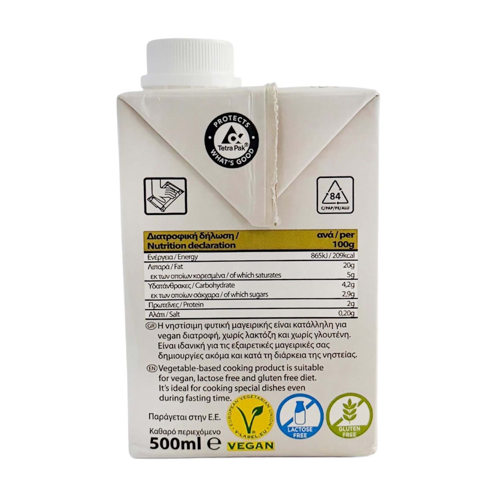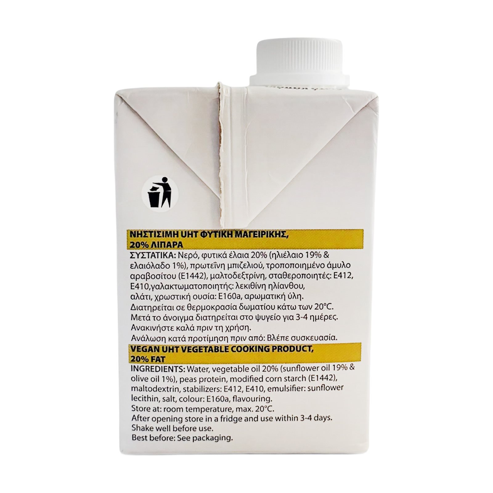 Νερό, φυτικά έλαια 20% (ηλιέλαιο 19% & ελαιόλαδο 1%), πρωτεΐνη μπιζελιού, τροποποιημένο άμυλο αραβοσίτου (Ε1442), μαλτοδεξτρίνη, σταθεροποιητές: Ε412, Ε410, γαλακτωματοποιητής: λεκιθίνη ηλίανθου, αλάτι, χρωστική ουσία: Ε160a, αρωματική ύλη.