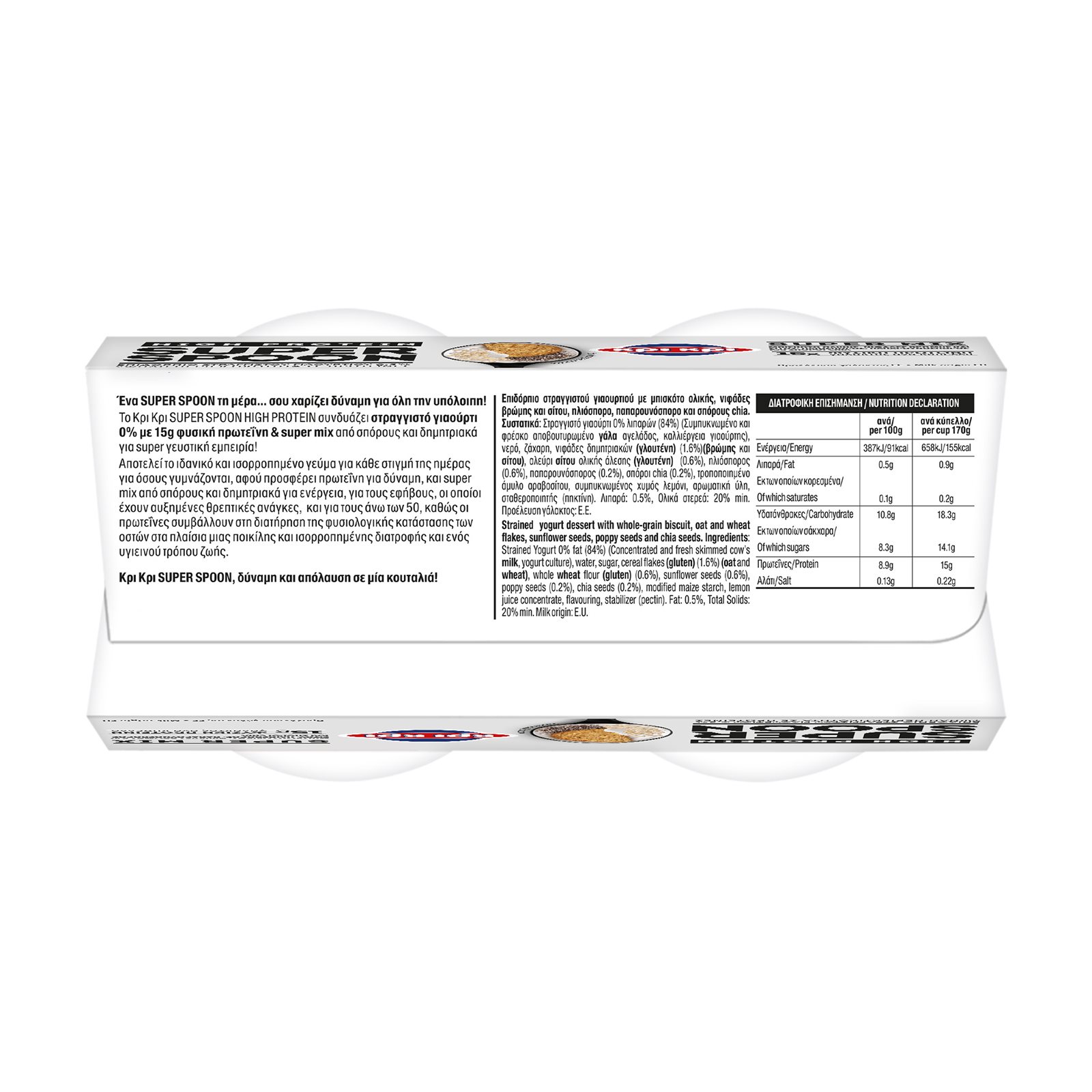 Στραγγιστό γιαούρτι 0% λιπαρών (84%) (Συμπυκνωμένο και φρέσκο αποβουτυρωμένο ΓΑΛΑ αγελάδος, καλλιέργεια γιαούρτης), νερό, ζάχαρη, νιφάδες δημητριακών (ΓΛΟΥΤΕΝΗ) (1.6%) (ΒΡΩΜΗΣ και ΣΙΤΟΥ), αλεύρι ΣΙΤΟΥ ολικής άλεσης (ΓΛΟΥΤΕΝΗ) (0.6%), ηλιόσπορος (0.6%), παπαρουνόσπορος (0.2%), σπόροι chia (0.2%), τροποποιημένο άμυλο αραβοσίτου, συμπυκνωμένος χυμός λεμόνι, αρωματική ύλη, σταθεροποιητής (πηκτίνη).