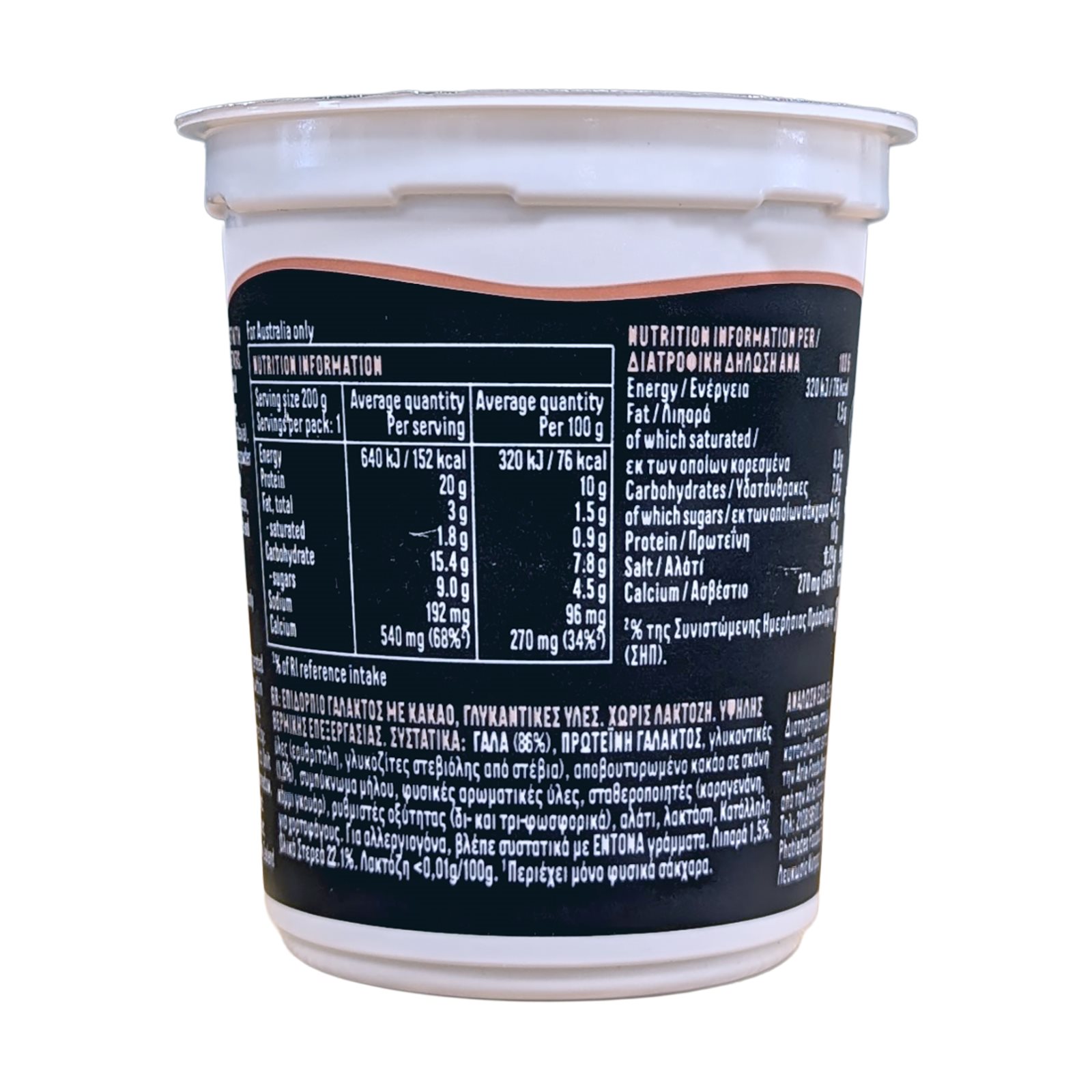 ΓΑΛΑ (86%), πρωτεΐνη ΓΑΛΑΚΤΟΣ, γλυκαντικές ύλες (ερυθριτόλη, γλυκοζίτες στεβιόλης από στέβια), αποβουτυρωμένο κακάο σε σκόνη (1,8%), συμπύκνωμα μήλου, φυσικές αρωματικές ύλες, σταθεροποιητές (καραγενάνη, κόμμι γκουάρ), ρυθμιστές οξύτητας (δι- και τρι-φωσφορικά), αλάτι, λακτάση.