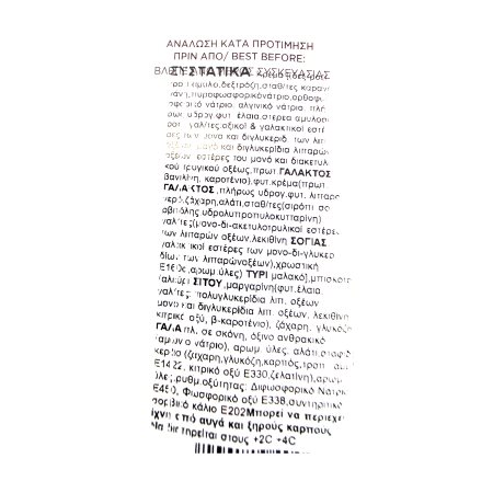 Κρέμα [(δεξτρόζη, τροποποιημένο άμυλο, δεξτρόζη, σταθεροποιητές καραγενάνι, πυροφωσφορικό νάτριο, ορθοφωσφορικό νάτριο, αλγινικό νάτριο, πλήρως υδρογονωμένα φυτικά έλαια, στερεά αμυλοσιροπίου, γαλακτωματοποιτές: οξικοί & γαλακτικοί εστέρες των μόνο και διγλυκεριδίων των λιπαρών οξέων, μονό και διγλυκερίδια λιπαρών οξέων, εστέρες του μονό και διακετυλικού τρυγικού οξέως, πρωτεΐνη ΓΑΛΑΚΤΟΣ, βανιλίνη, καροτένιο), φυτική κρέμα (πρωτεΐνη ΓΑΛΑΚΤΟΣ πλήρως υδρογονωμένα φυτικά λιπαρά, νερό, ζάχαρη, αλάτι, σταθεροποιητές (σιρόπι σορβιτόλης υδρολυπροπυλοκυτταρίνη) γαλακτωματοποιητές (μονο-δι-ακετυλοτρυλικοί εστέρες των λιπαρών οξέων, λεκιθίνη ΣΟΓΙΑΣ, γαλακτικοί εστέρες των μονο-δι-γλυκερδίων των λιπαρών οξέων), χρωστική Ε160), αρωματικές ύλες) ΤΥΡΙ μαλακό], μπισκότο (αλεύρι ΣΙΤΟΥ, μαργαρίνη (φυτικά έλαια, γαλακτωματοποιητές: πολυγλυκερίδια λιπαρών οξέων μόνο και διγλυκερίδια λιπαρών οξέων, λεκιθίνη, κιτρικό οξύ, β-καροτένιο), ζάχαρη, γλυκόζη ΓΑΛΑ πλήρες σε σκόνη, όξινο ανθρακικό (αμμώνιο νάτριο) , αρωματικές ύλες, αλάτι, σταφίδα) κεράσι (ζάχαρη, γλυκόζη, καρπός, τροποποιημένο άμυλο Ε1422, κιτρικό οξύ Ε330, ζελατίνη), αρωματικές ύλες, ρυθμιστής οξύτητας: Διφωσφορικό Νάτριο Ε450), φωσφορικό οξύ Ε338, συντηρητικό σορβικό κάλιο Ε202.