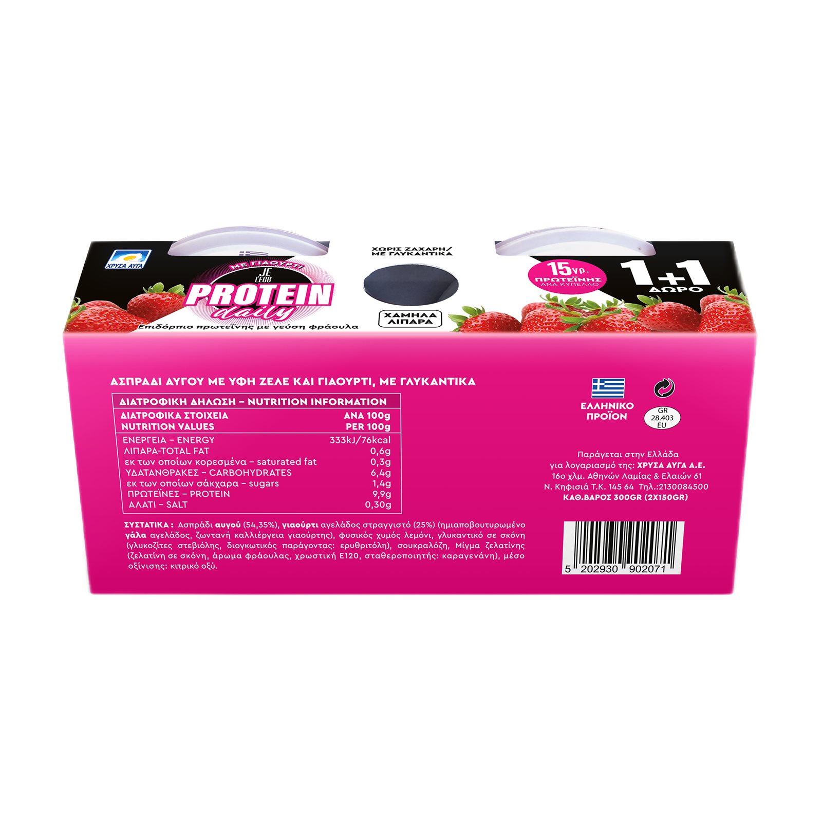 ΧΡΥΣΑ ΑΥΓΑ Je L'egg Protein Daily Επιδόρπιο Ασπραδιού με Γιαούρτι & γεύση Φράουλα Χωρίς προσθήκη ζάχαρης 150g +1 Δώρο