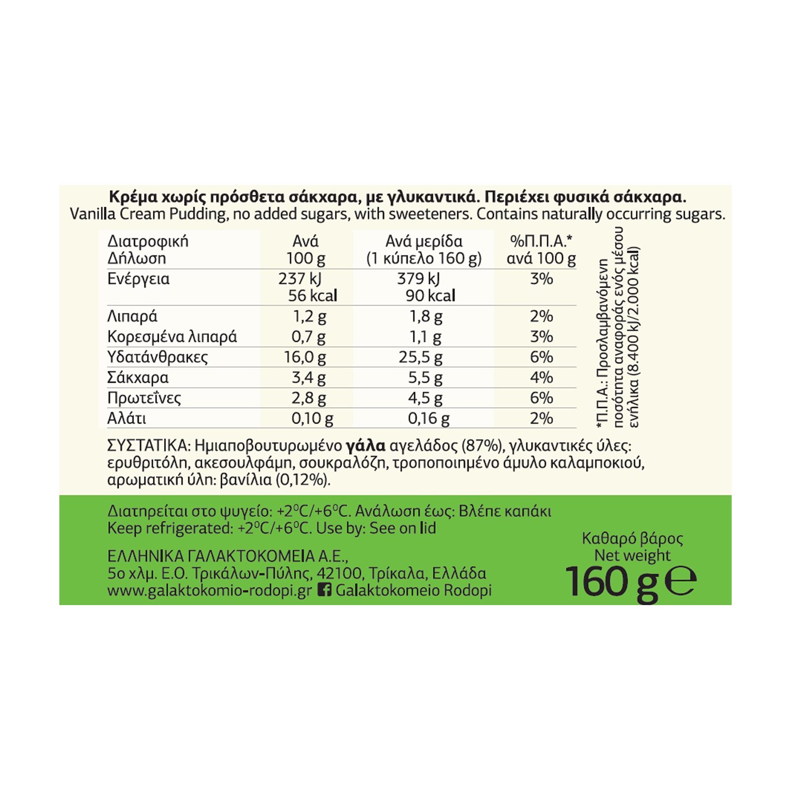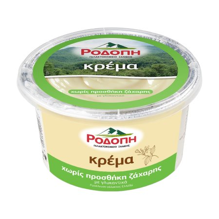 Κρέμα χωρίς πρόσθετα σάκχαρα, με γλυκαντικά. Περιέχει φυσικά σάκχαρα.