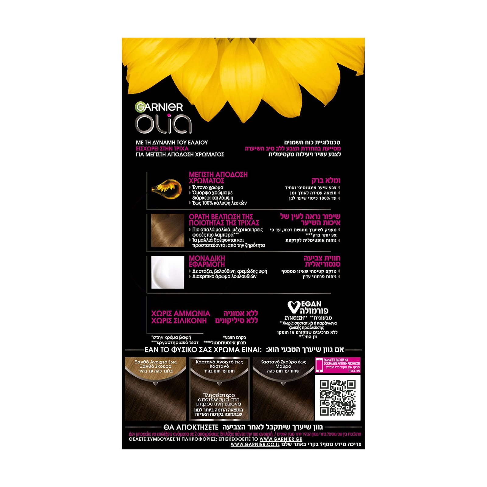 Mόνιμη βαφή της Garnier, με τη δύναμη του ελαίου το οποίο εισχωρεί μέσα στη τρίχα χαρίζοντας πλούσιο και λαμπερό χρώμα, βελτιώνοντας τη ποιότητα της τρίχας σε κάθε βαφή. Η Olia είναι μία μόνιμη βαφή, χωρίς αμμωνία και χωρίς σιλικόνη εμπλουτισμένη με 60% έλαια και προσφέρει 3 φορές περισσότερη λάμψη στην τρίχα. Έως 100% κάλυψη των λευκών.