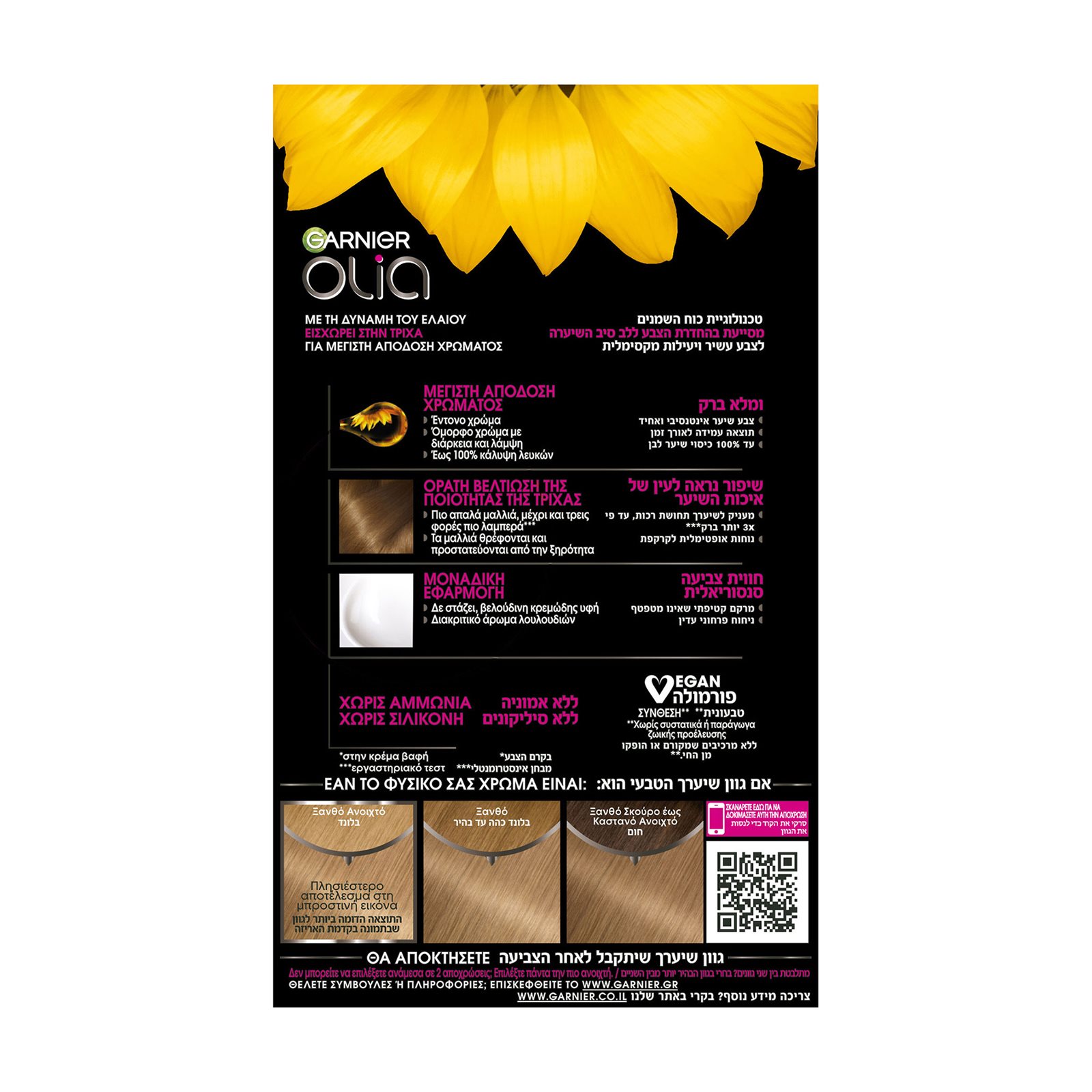Mόνιμη βαφή της Garnier, με τη δύναμη του ελαίου το οποίο εισχωρεί μέσα στη τρίχα χαρίζοντας πλούσιο και λαμπερό χρώμα, βελτιώνοντας τη ποιότητα της τρίχας σε κάθε βαφή. Η Olia είναι μία μόνιμη βαφή, χωρίς αμμωνία και χωρίς σιλικόνη εμπλουτισμένη με 60% έλαια και προσφέρει 3 φορές περισσότερη λάμψη στην τρίχα. Έως 100% κάλυψη των λευκών.