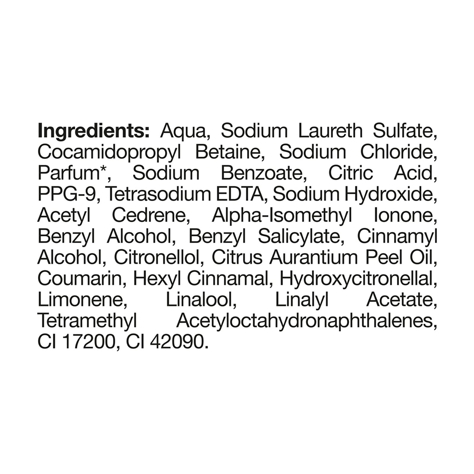 Aqua, Sodium Laureth Sulfate, Cocamidopropyl Betaine, Sodium Chloride, Parfum*, Sodium Benzoate, Citric Acid, PPG-9, Tetrasodium EDTA, Sodium Hydroxide, Acetyl Cedrene, Alpha-Isomethyl Ionone, Benzyl Alcohol, Benzyl Salicylate, Cinnamyl Alcohol, Citronellol, Citrus Aurantium Peel Oil, Coumarin, Hexyl Cinnamal, Hydroxycitronellal, Limonene, Linalool, Linalyl Acetate, Tetramethyl Acetyloctahydronaphthalenes, CI 17200, CI 42090.