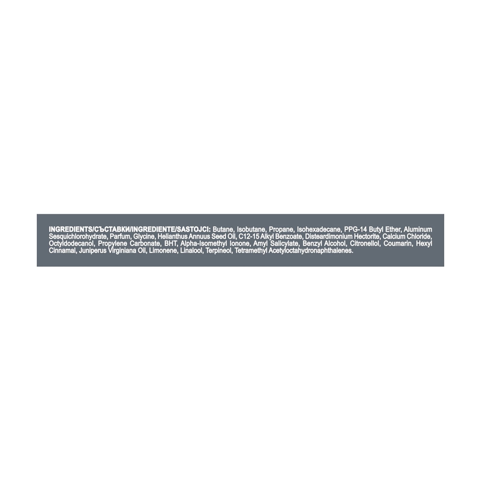 Butane, isobutane, propane, cyclopentasiloxane, ppg-14 butyl ether, aluminum sesquichlorohydrate, parfum, glycine, helianthus annuus seed oil, c12-15 alkyl benzoate, disteardimonium hectorite, calcium chloride, octyldodecanol, bht, propylene carbonate, dimethiconol, alpha-isomethyl ionone, benzyl alcohol, citronellol, coumarin, hexyl cinnamal, limonene, linalool.