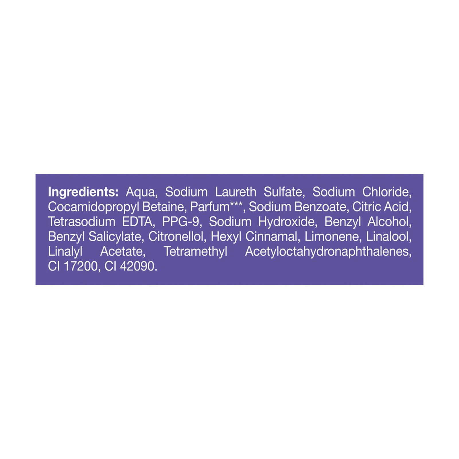 Aqua, Sodium Laureth Sulfate, Sodium Chloride, Cocamidopropyl Betaine, Parfum***, Sodium Benzoate, Citric Acid, Tetrasodium EDTA, PPG-9, Sodium Hydroxide, Benzyl Alcohol, Benzyl Salicylate, Citronellol, Hexyl Cinnamal, Limonene, Linalool, Linalyl Acetate, Tetramethyl Acetyloctahydronaphthalenes, CI 17200, CI 42090.