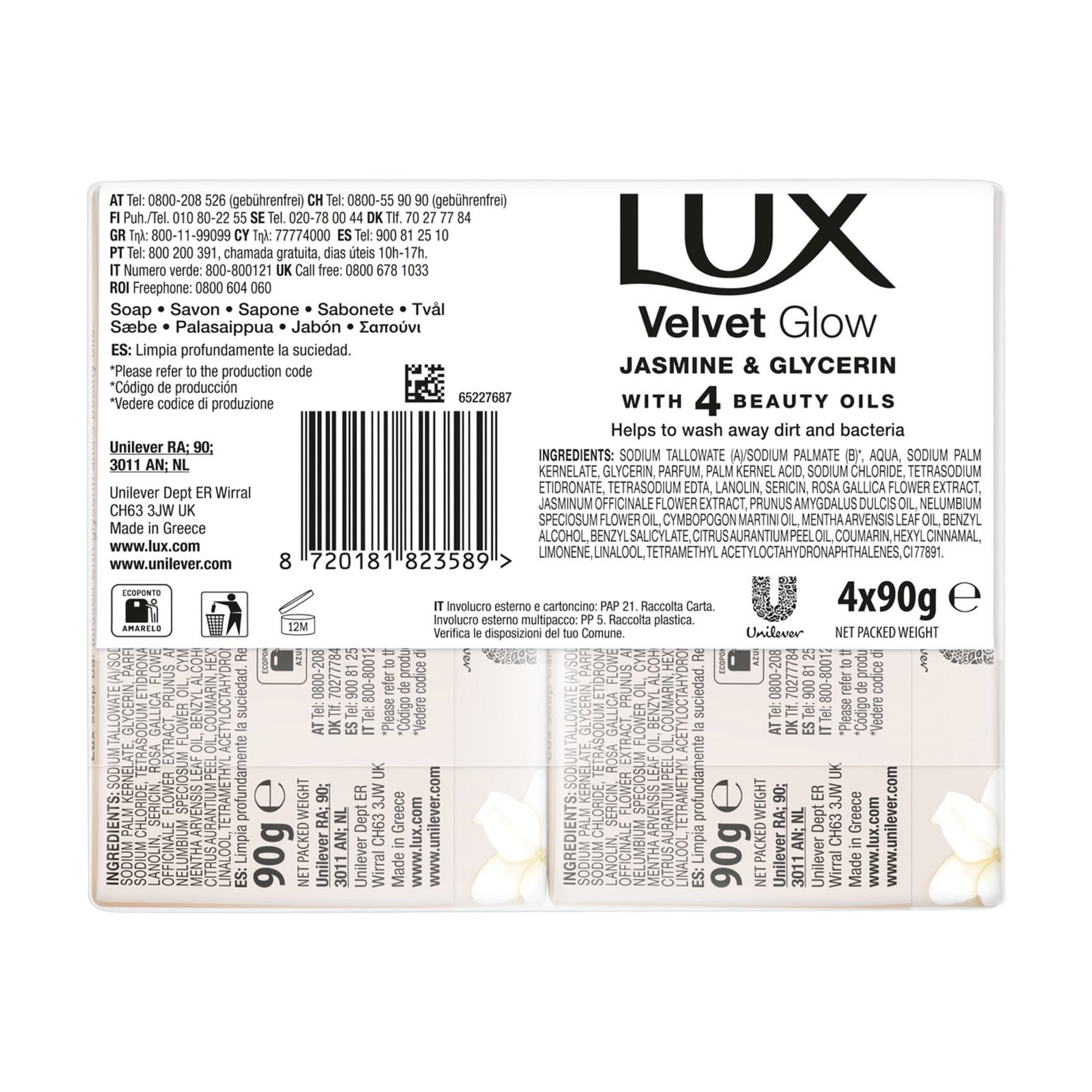 Sodium Tallowate (A)/Sodium Palmate (B)*, Aqua, Sodium Palm Kernelate, Glycerin, Parfum, Palm Kernel Acid, Sodium Chloride, Tetrasodium Etidronate, Tetrasodium EDTA, Lanolin, Sericin, Rosa Gallica Flower Extract, Jasminum Officinale Flower Extract, Prunus Amygdalus Dulcis Oil, Nelumbium Speciosum Flower Oil, Cymbopogon Martini Oil, Mentha Arvensis Leaf Oil, Benzyl Alcohol, Benzyl Salicylate, Citrus Aurantium Peel Oil, Coumarin, Hexyl Cinnamal, Limonene, Linalool, Tetramethyl Acetyloctahydronaphthalenes, CI 77891.