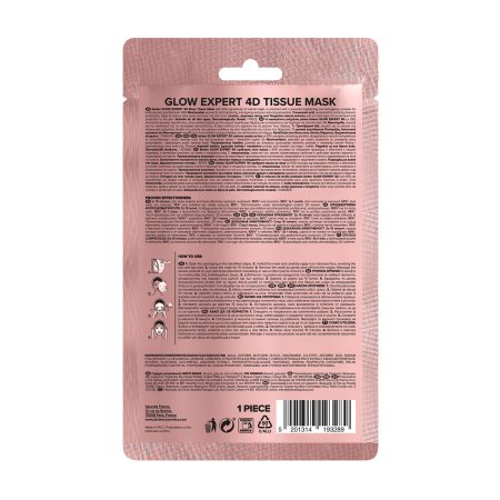 H υφασμάτινη ασημένια μάσκα Glow Expert 4D με 93% συστατικά φυσικής προέλευσης, είναι εμπλουτισμένη με ένα ισχυρό σύμπλεγμα λάμψης και αντιγήρανσης για λαμπερή και νεανική όψη. Με Νιασιναμίδη, γνωστή για την ικανότητά της να προσφέρει φωτεινότητα, να δρα ενάντια στη γήρανση και να μειώνει τους πόρους. To Τρανεξαμικό Οξύ, γνωστό για τη μείωση της παραγωγής μελανίνης, βοηθά στη μείωση των μαύρων κηλίδων και στην εξομάλυνση του τόνου του δέρματος. Τα φυσικά εκχυλίσματα Γλυκόριζας, Ιαπωνικού κερασιού και Μανταρινιού προσθέτουν ένα επιπλέον στρώμα θρέψης και προστασίας στο δέρμα.